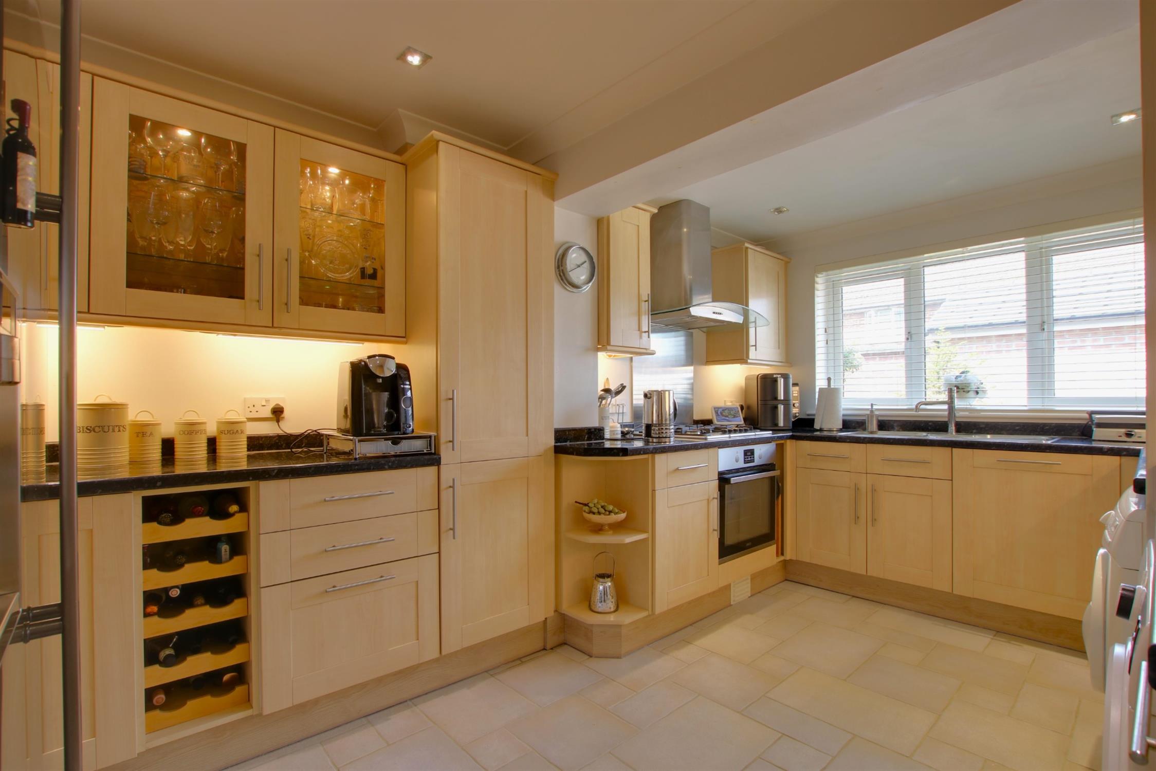 Tiled flooring. Matching wall and base units. Integrated dishwasher, electric oven and gas hob. Space for a washing machine, tumble dryer and fridge-freezer. Inset stainless steel sink. Double-glazed window to front aspect. Radiator.