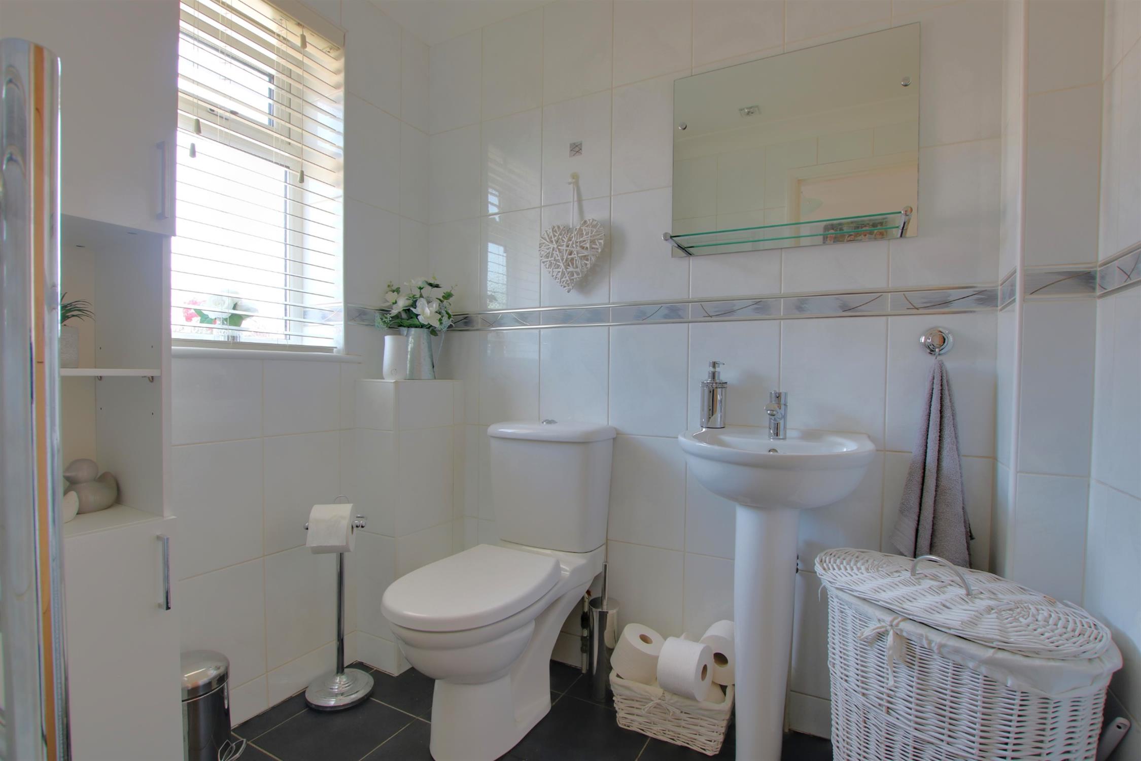 Tiled flooring and walls. Low level W.C and basin. Obscure double-glazed window to front aspect. Heated towel rail.
