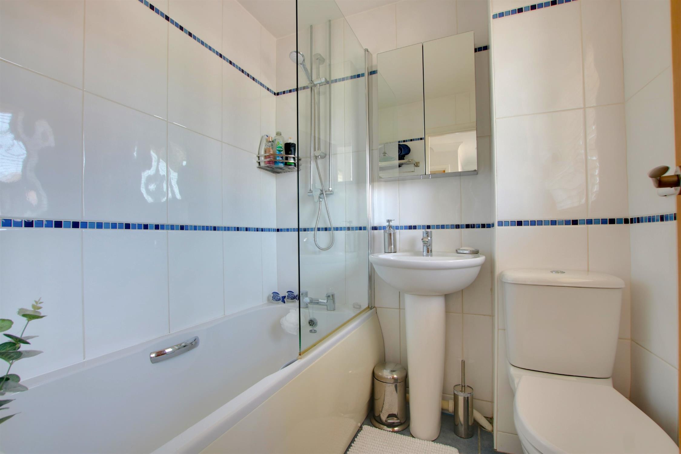 Tiled flooring and walls. Panel enclosed bath with shower. Low level W.C and basin. Obscure double-glazed window to front aspect. Radiator.