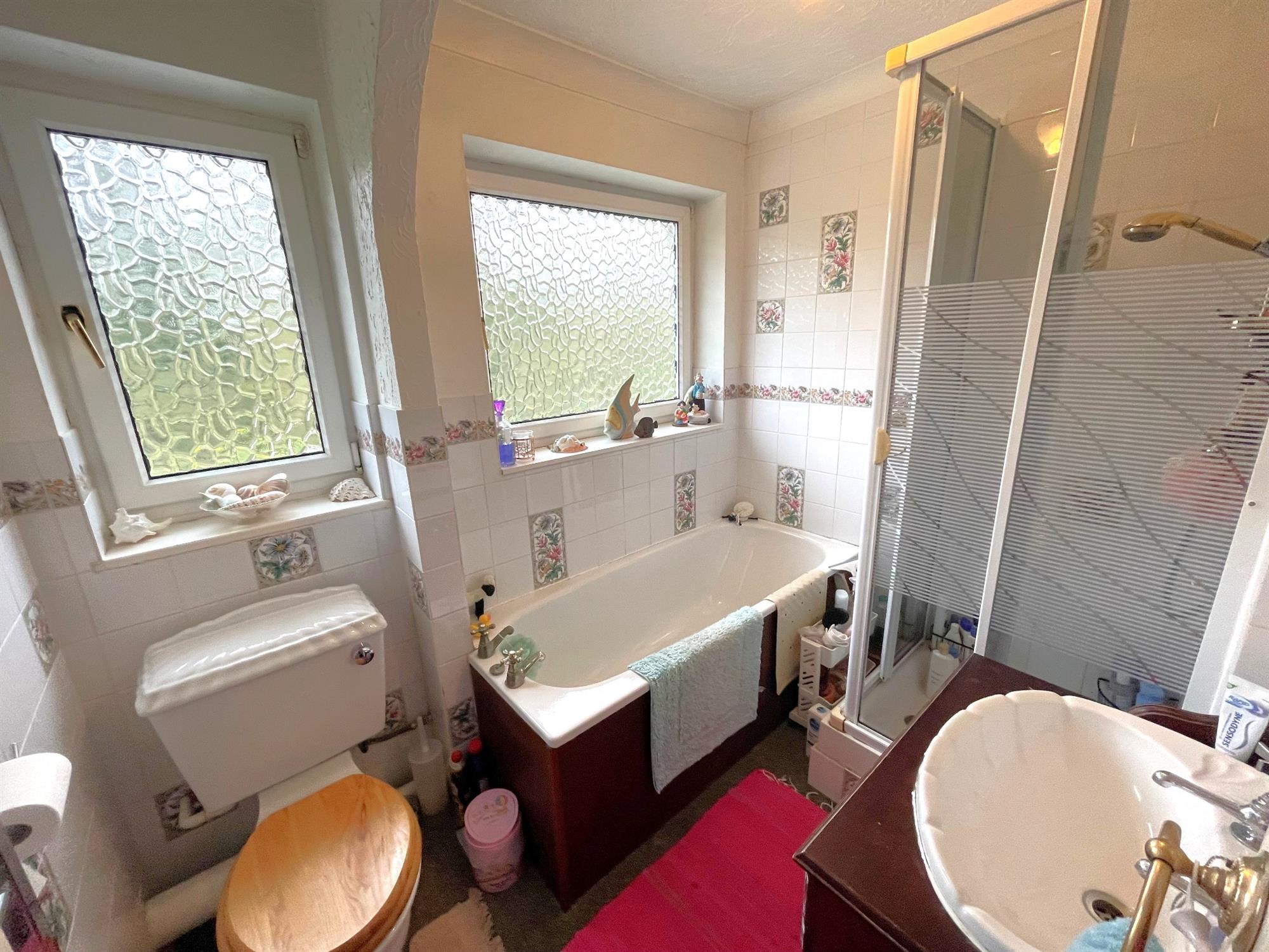 Two windows to rear. Low level WC. Inset wash hand basin with cupboard below. Panelled bath. Shower cubicle with glazed screen. Complementary tiling. Radiator.