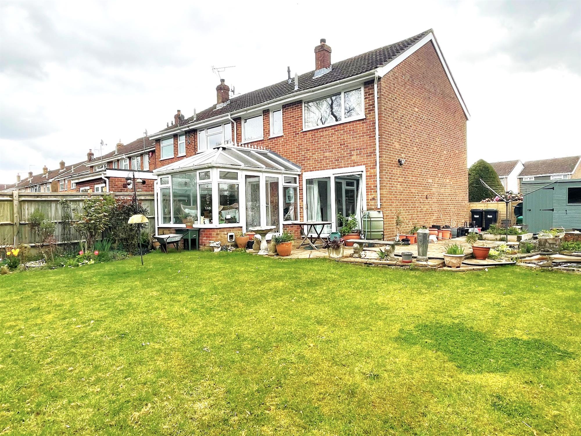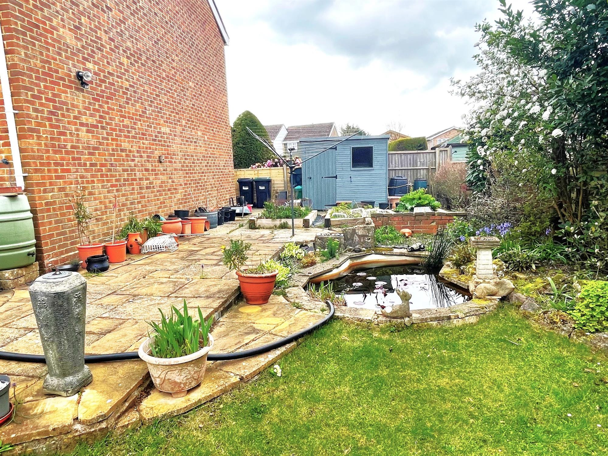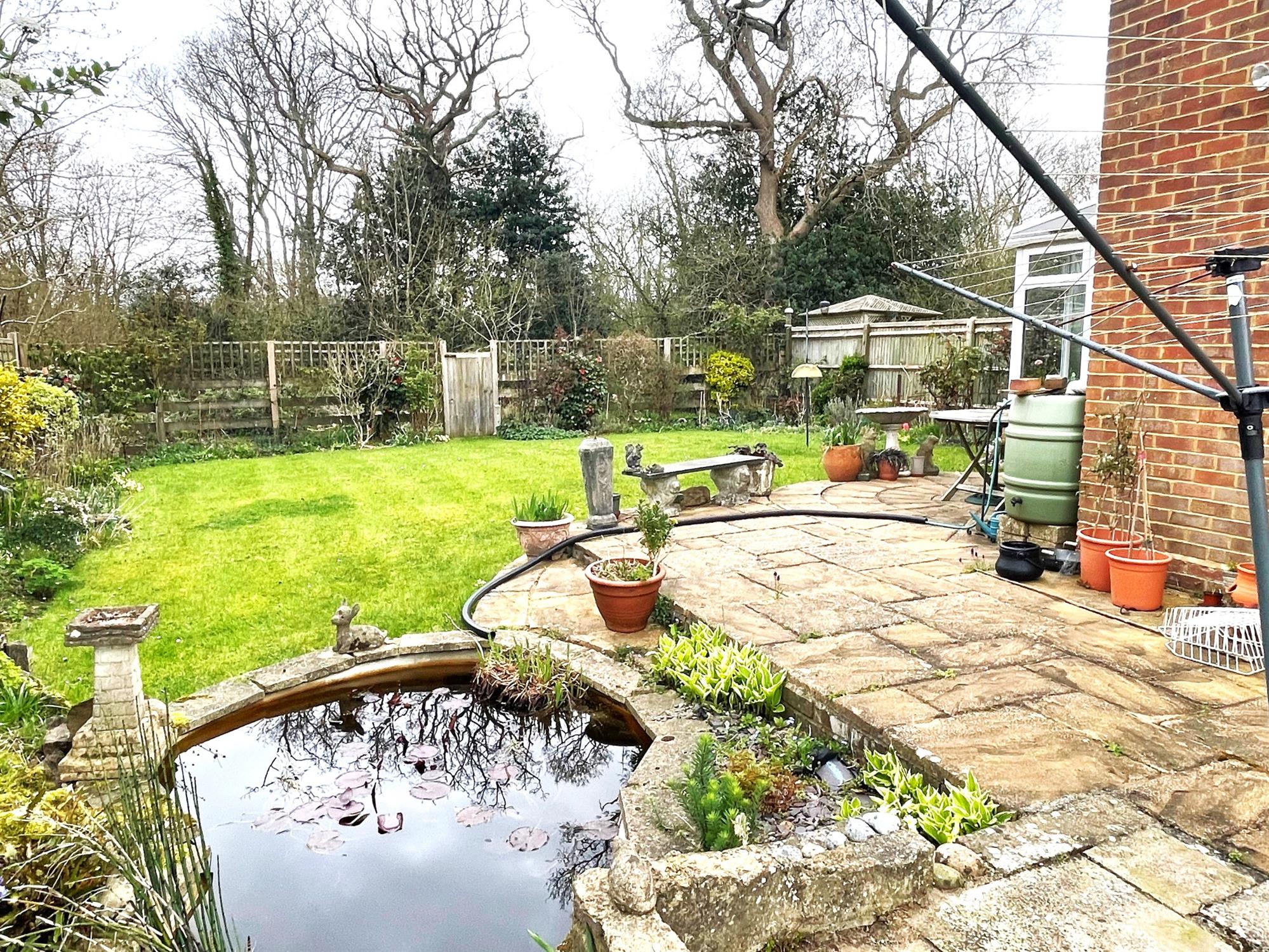 A feature of this property and backing onto woodland. Laid to lawn with shrubs, plants and bushes. Paved patio. Ornamental fishpond. Raised planters. Garden shed. Pedestrian side access gate.