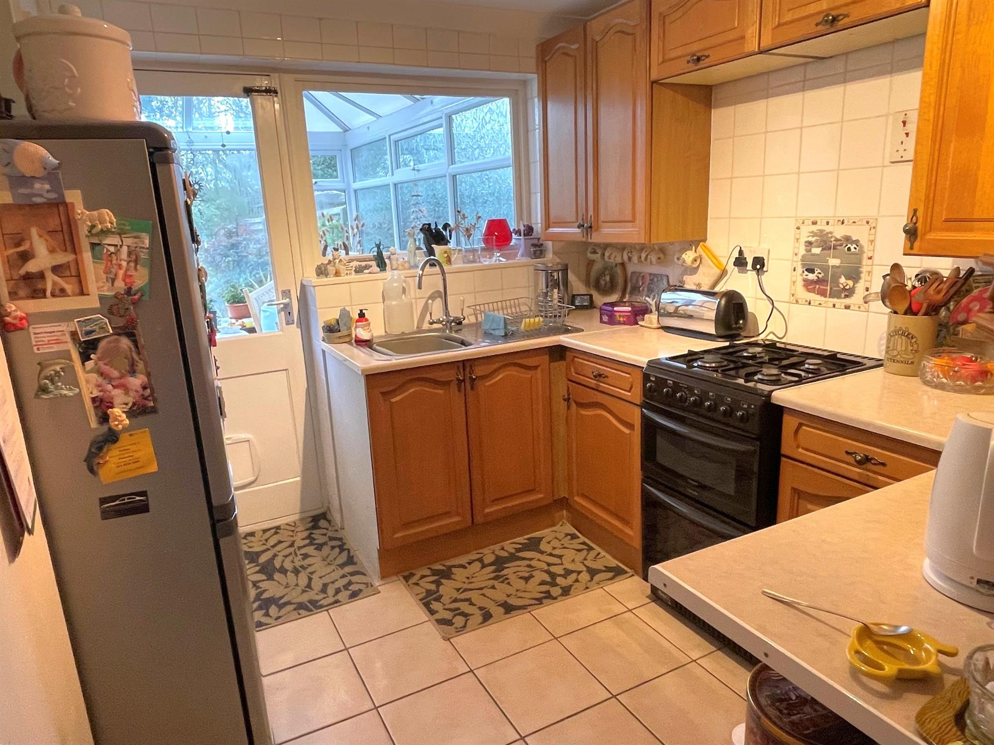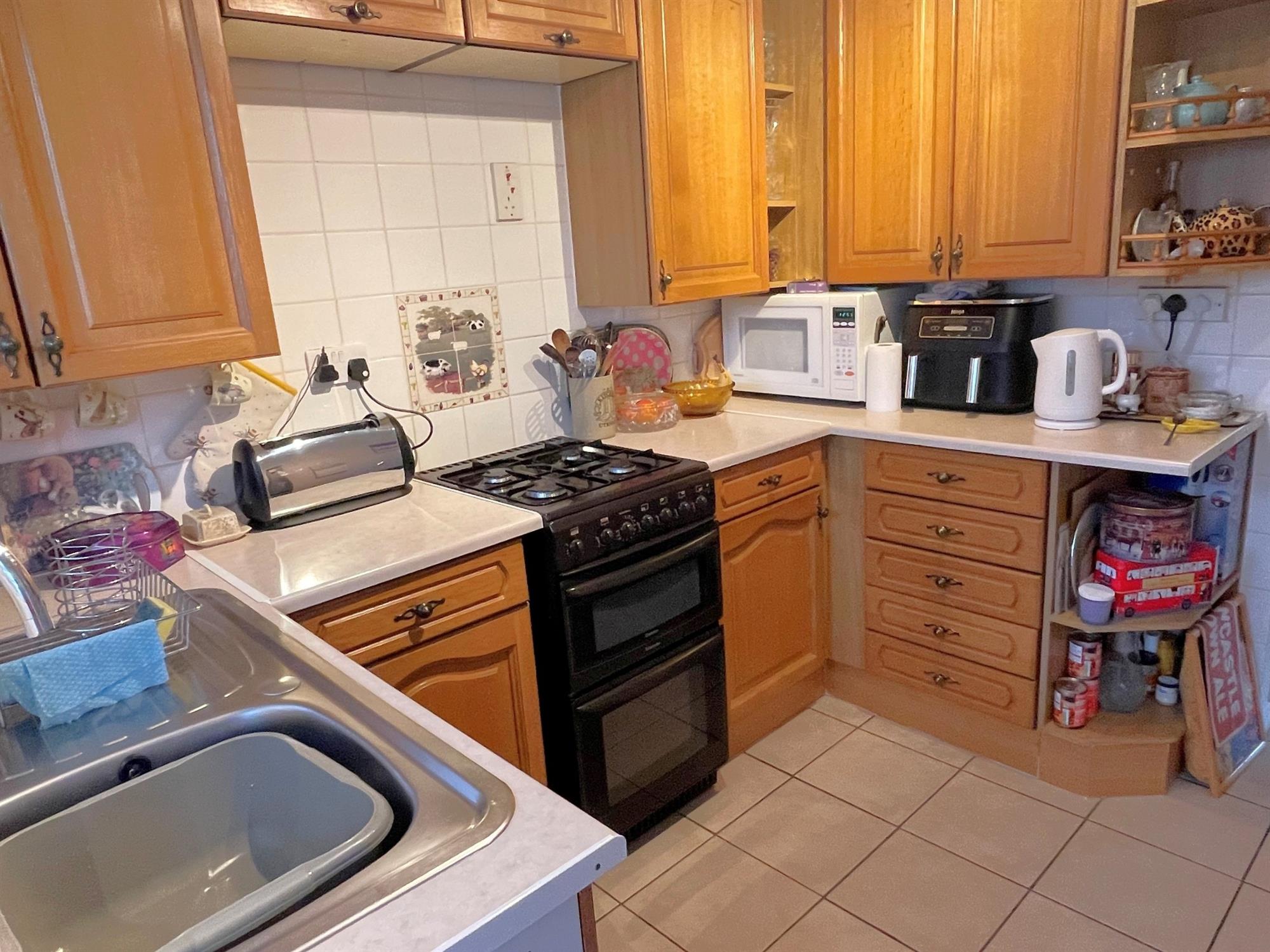 Window to rear. Range of wall and base units with work surfaces over. Single drainer stainless steel sink unit. Space for cooker with extractor over. Tiled splashbacks. Space for fridge/freezer. Built in storage cupboard. Further built-in storage cupboard understairs. Door into: