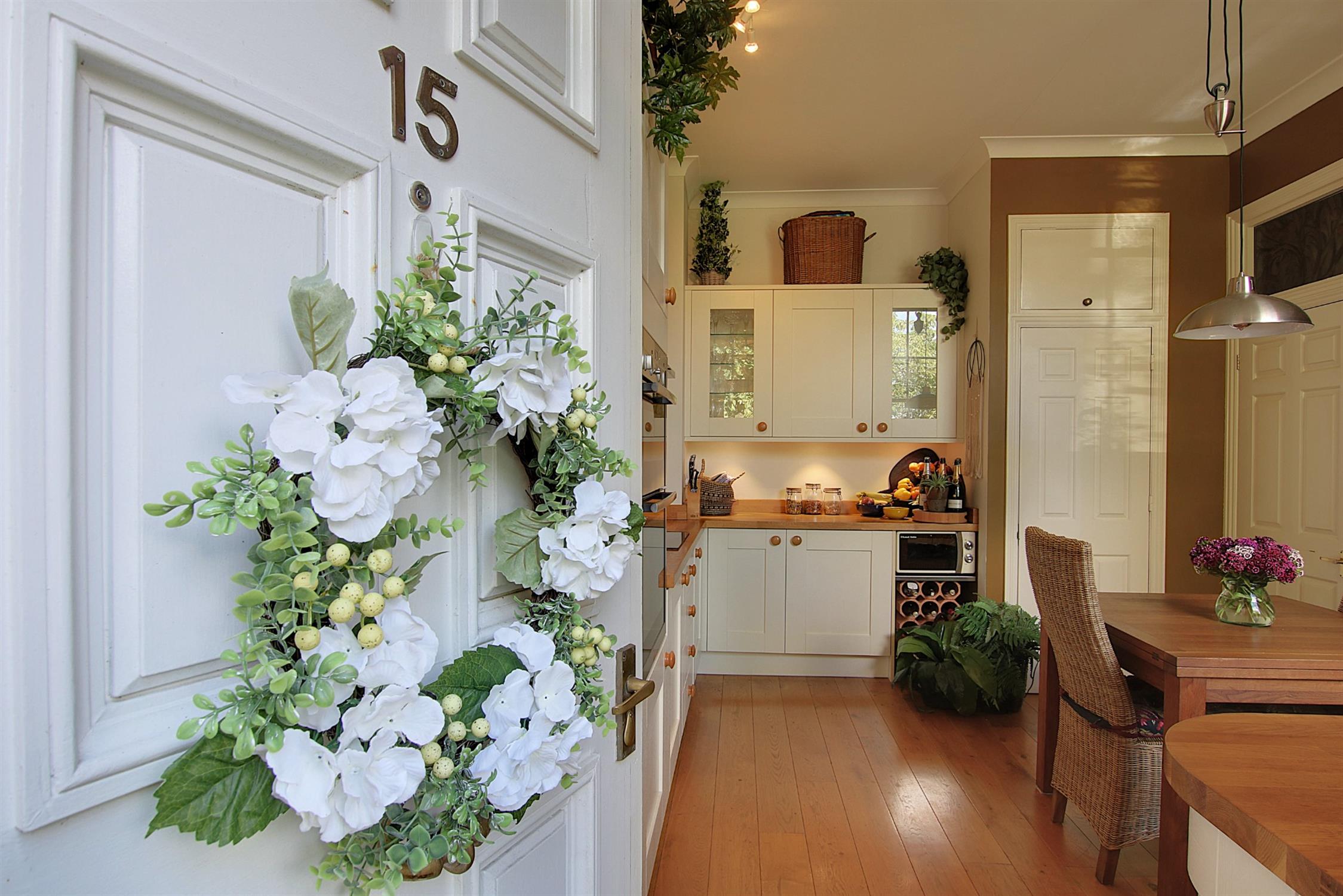 Very tastefully fitted with extensive wall and base units with solid oak worktops above and matching upstands, inset one-and-a-half bowl single drainer enamel sink with mixer tap over, built-in electric double oven, induction hob and fridge/freezer, space for dishwasher, sash window to the rear, wood flooring, airing cupboard housing the hot water tank, door to the rear providing a private, separate point of entry and exit.