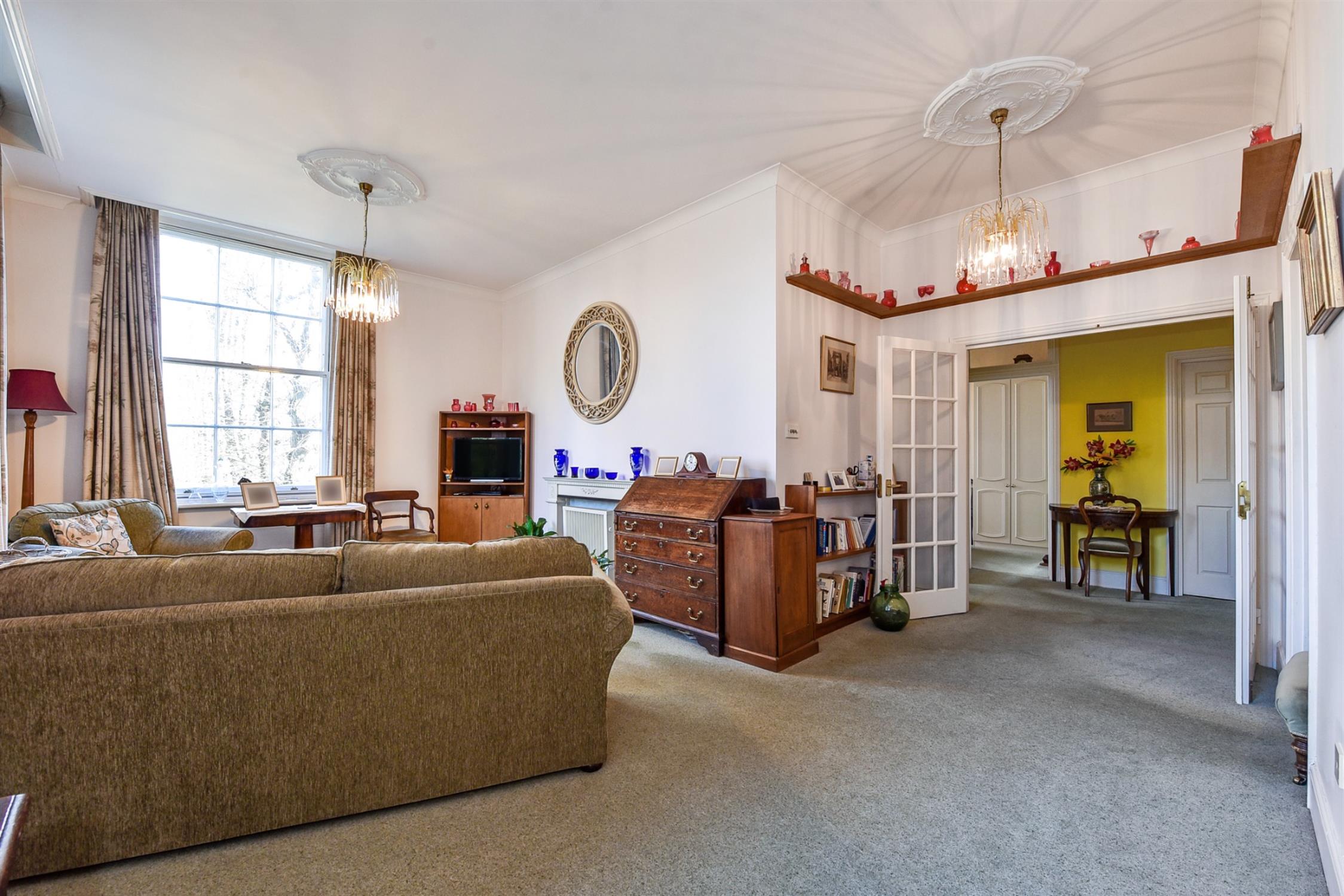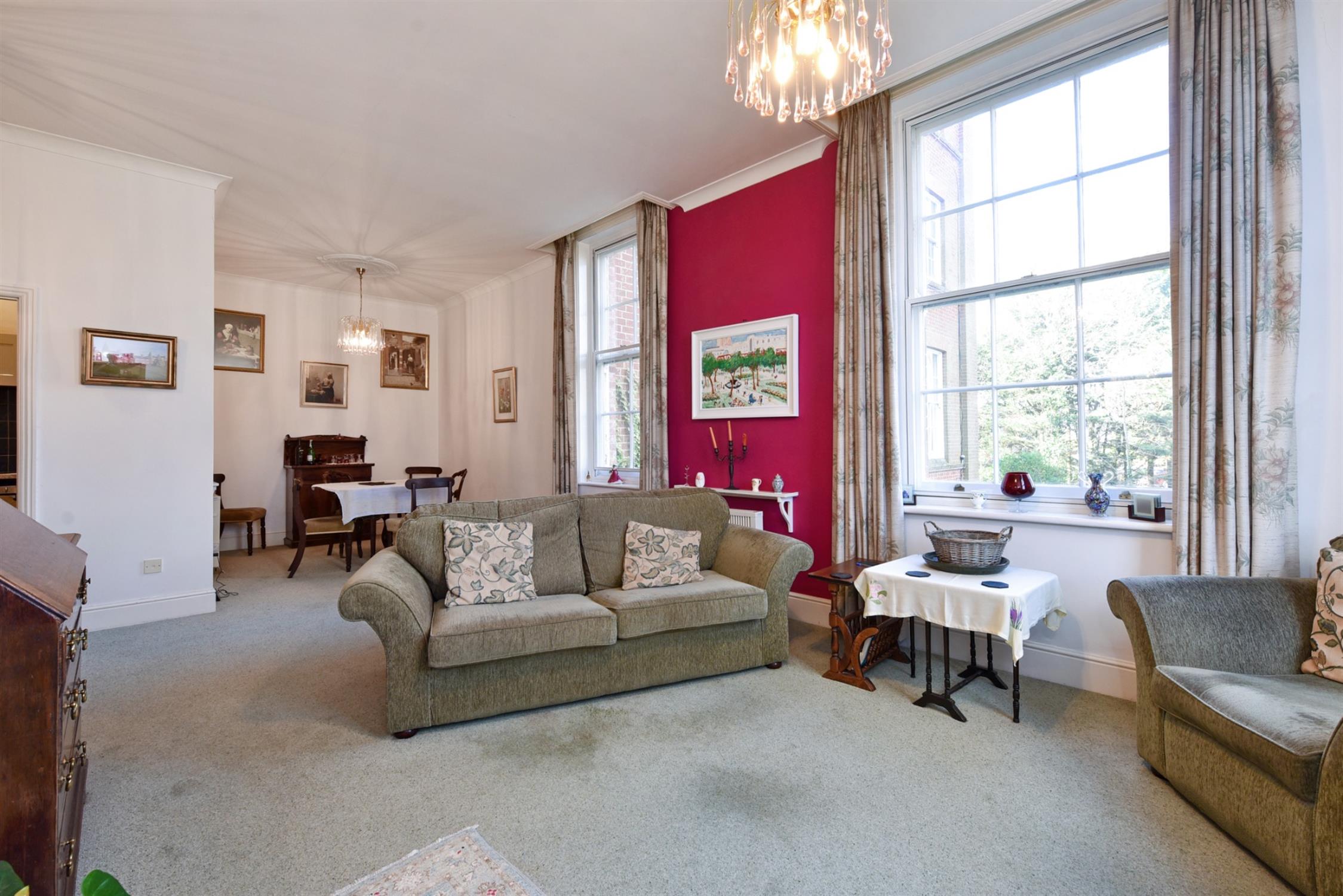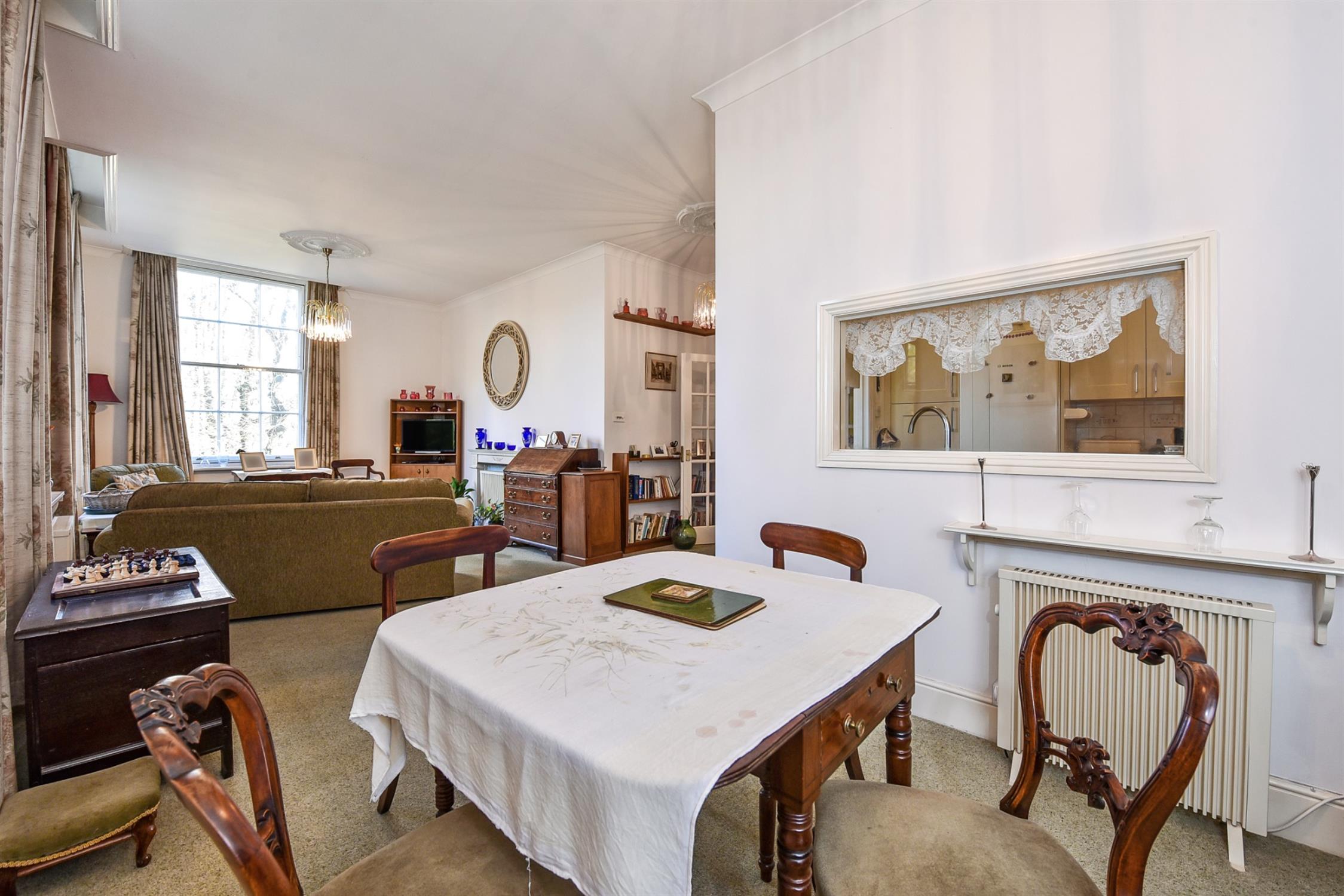 Large Georgian-style sash windows fill the apartment with natural light, creating a bright, airy, and spacious atmosphere. The private entrance hallway leads to all the principal rooms. The sitting room boasts elegant proportions with high ceilings and three large sash windows across two aspects, offering a delightful outlook over the gardens and rear of the development. The kitchen is contained within this space and could lend itself to an open-plan conversion, subject to permission.