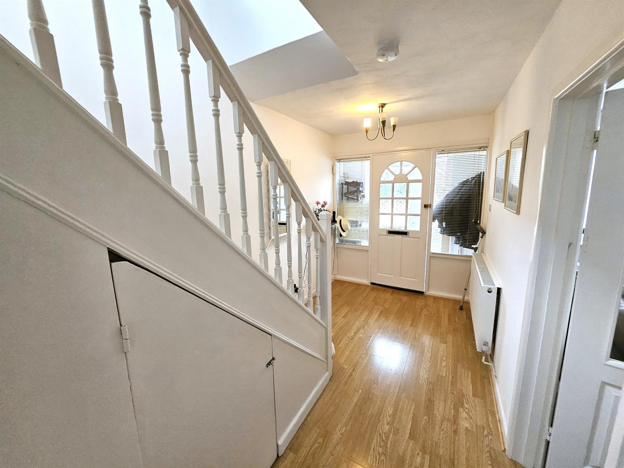 Timber effect laminated flooring, stairs rising to the first floor, radiator, under stairs cupboards, doors to:
