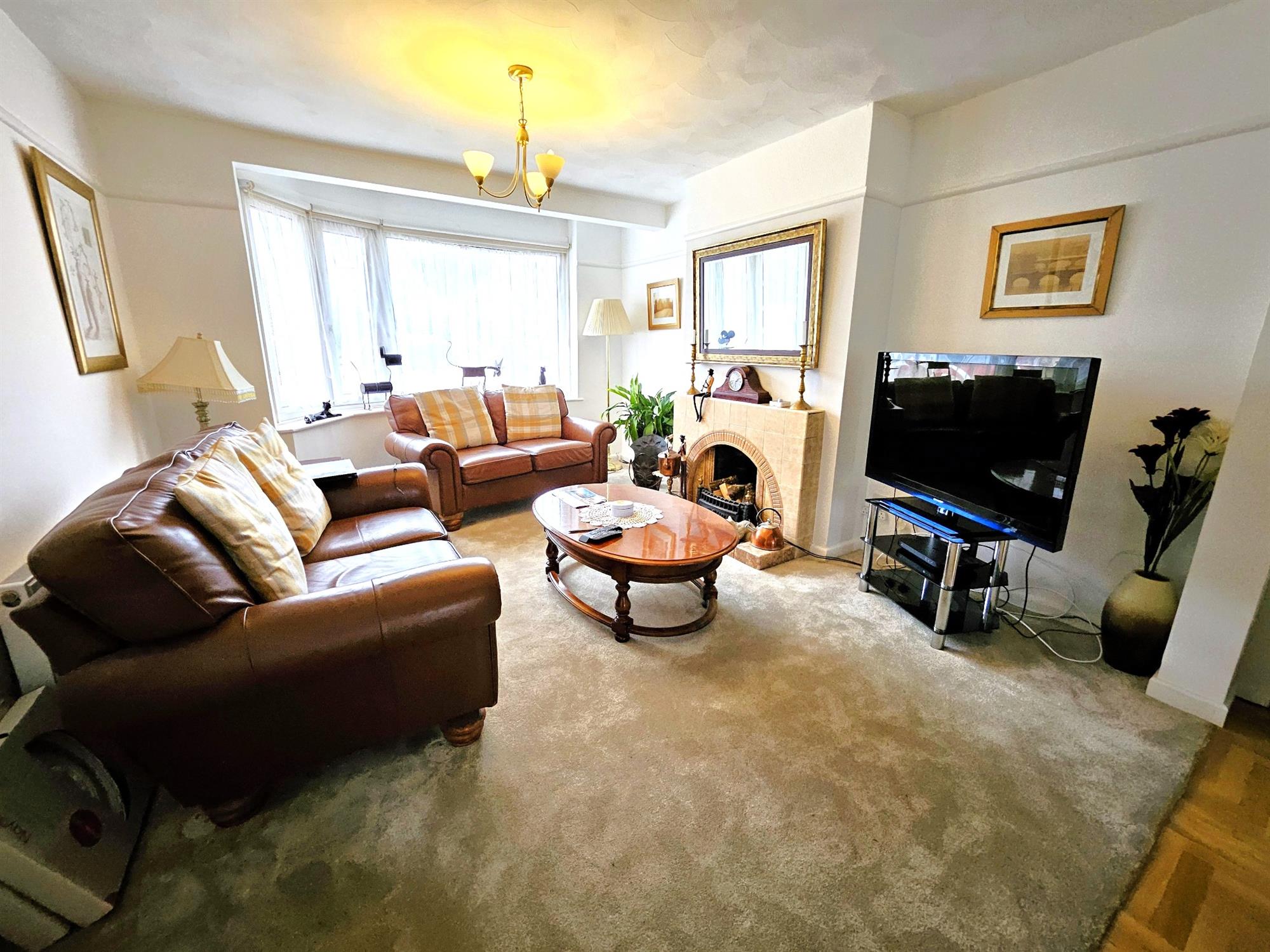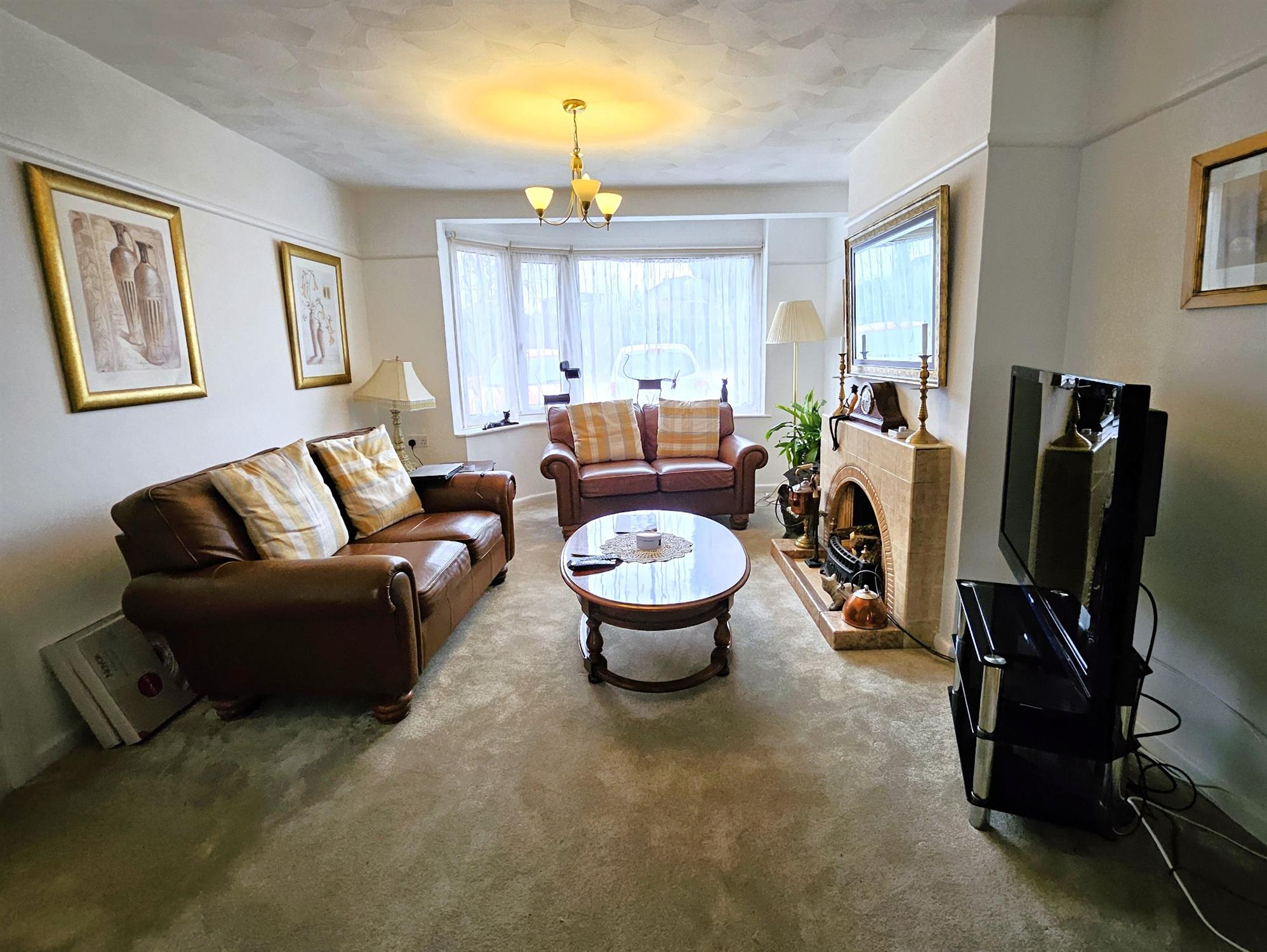 Double-glazed walk in bay window to the front aspect, ceramic tiled fireplace with open fire, TV aerial point, radiators, picture rail, carpeted flooring, open aspect to: