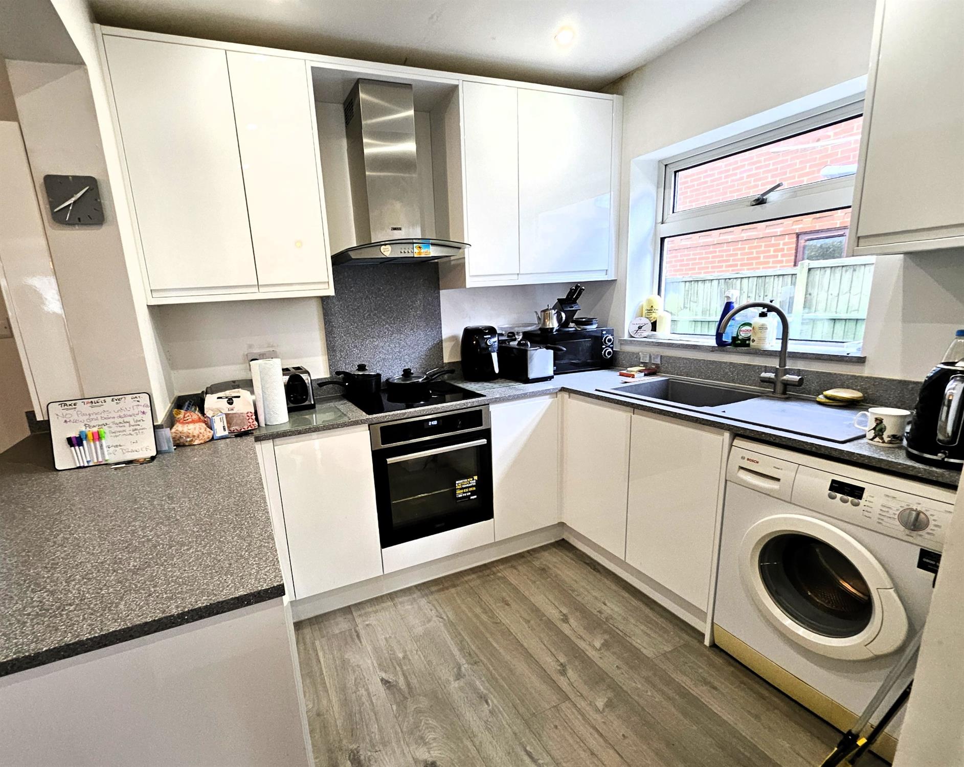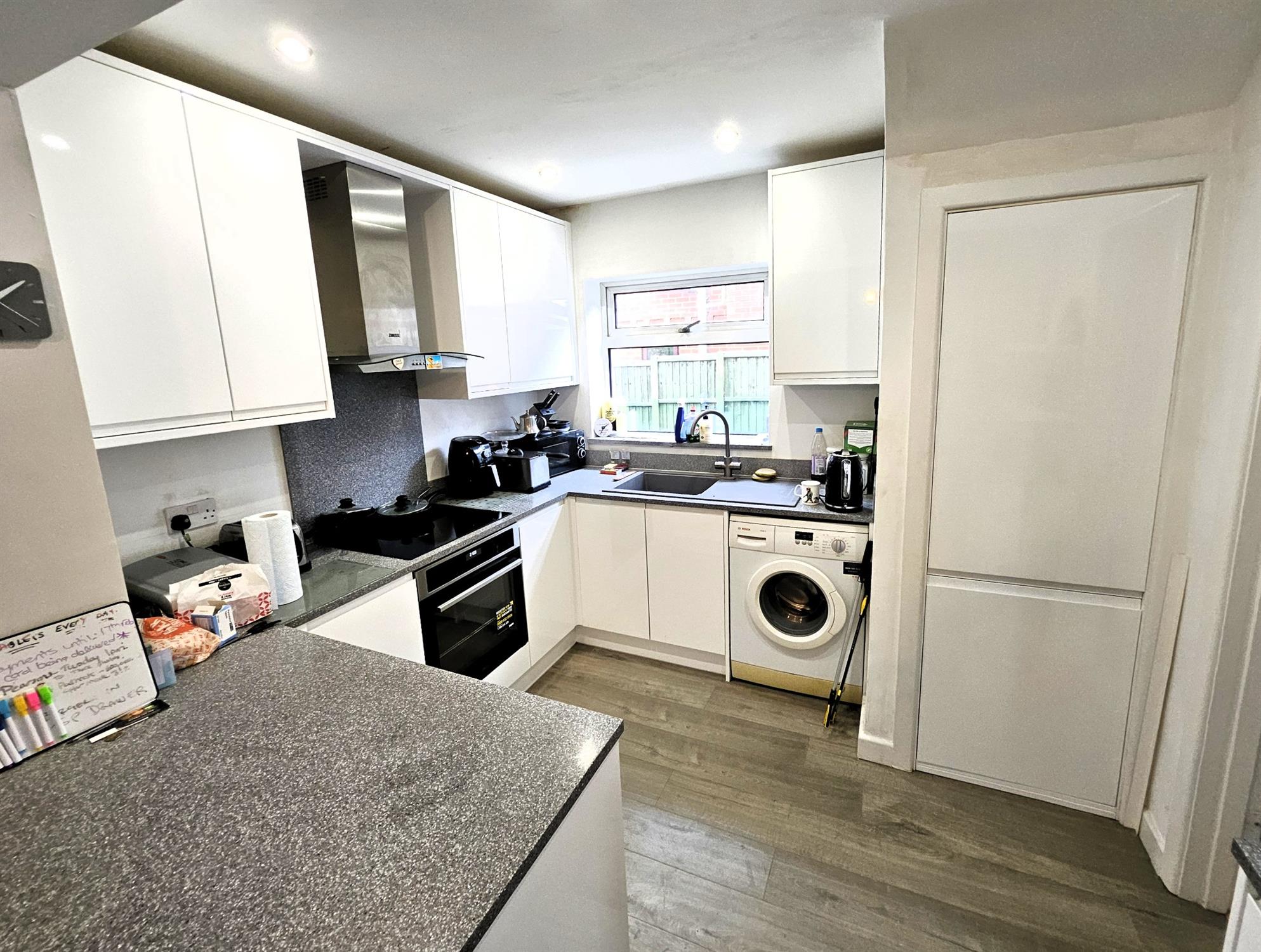 A good range of white gloss fronted eye and base level units with fitted work surfaces, fitted oven, hob with extractor fan hood over, double-glazed window to the side aspect fitted upright fridge - freezer, inset sink with mixer tap over, space and plumbing for automatic washing machine, timber effect vinyl flooring, peninsular breakfast bar opening to the dining room.