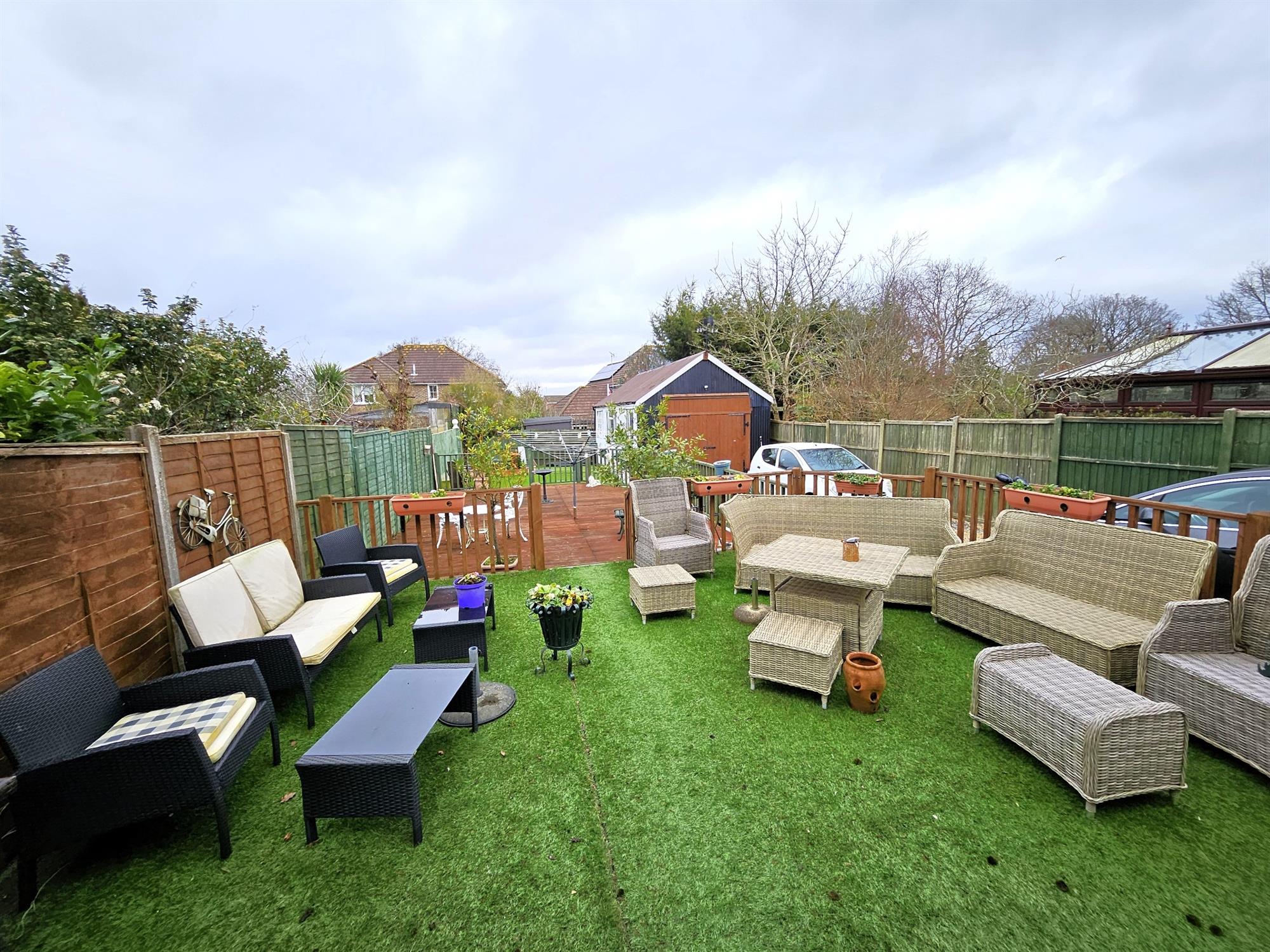 The rear garden is of a generous size with a westerly aspect, enclosed with panel fencing, timber deck areas, artificial lawn areas . Large rear workshop / garage, side driveway providing lots of off-road parking and leading to the frontage, pea shingle hardstandings providing further parking spaces.
