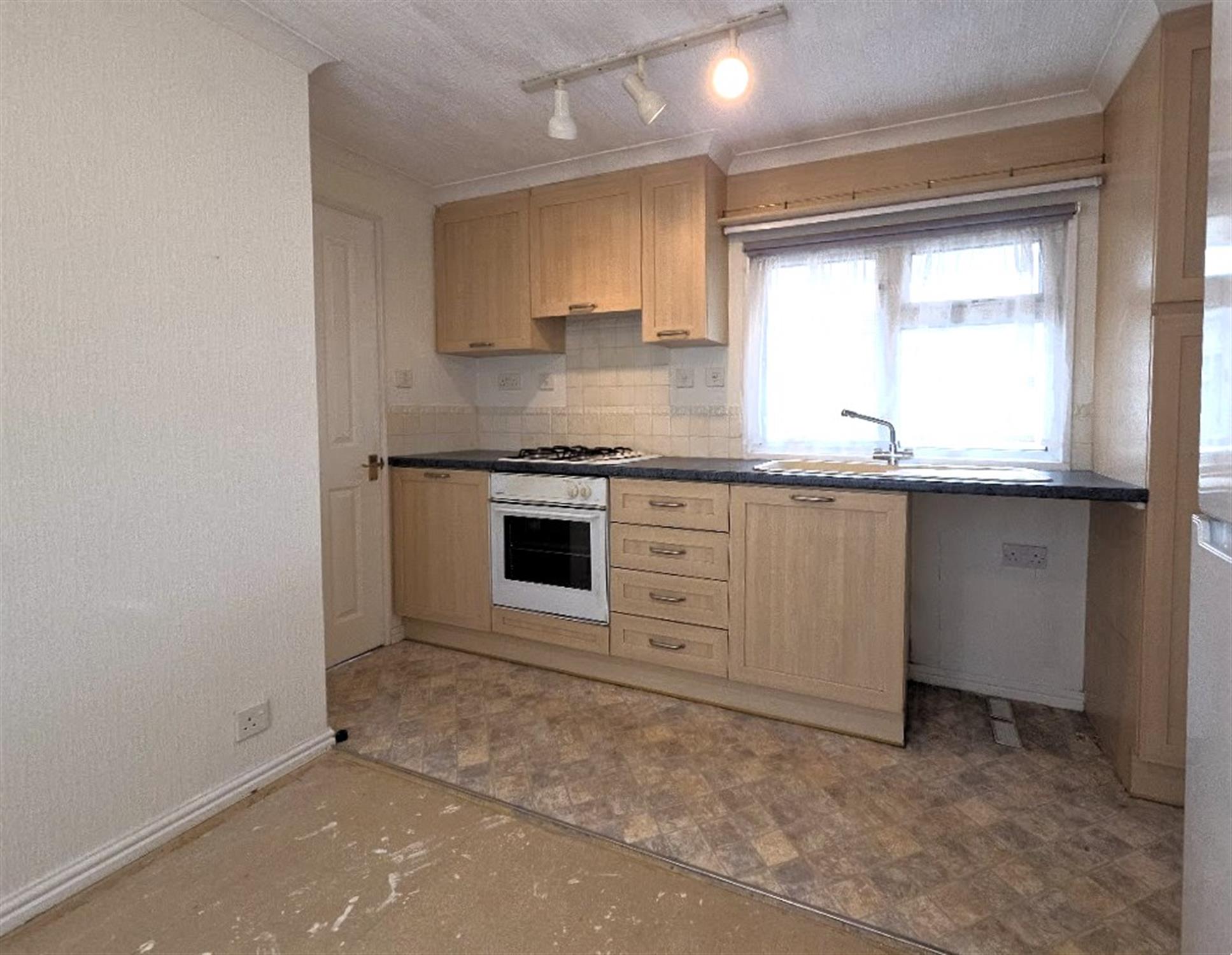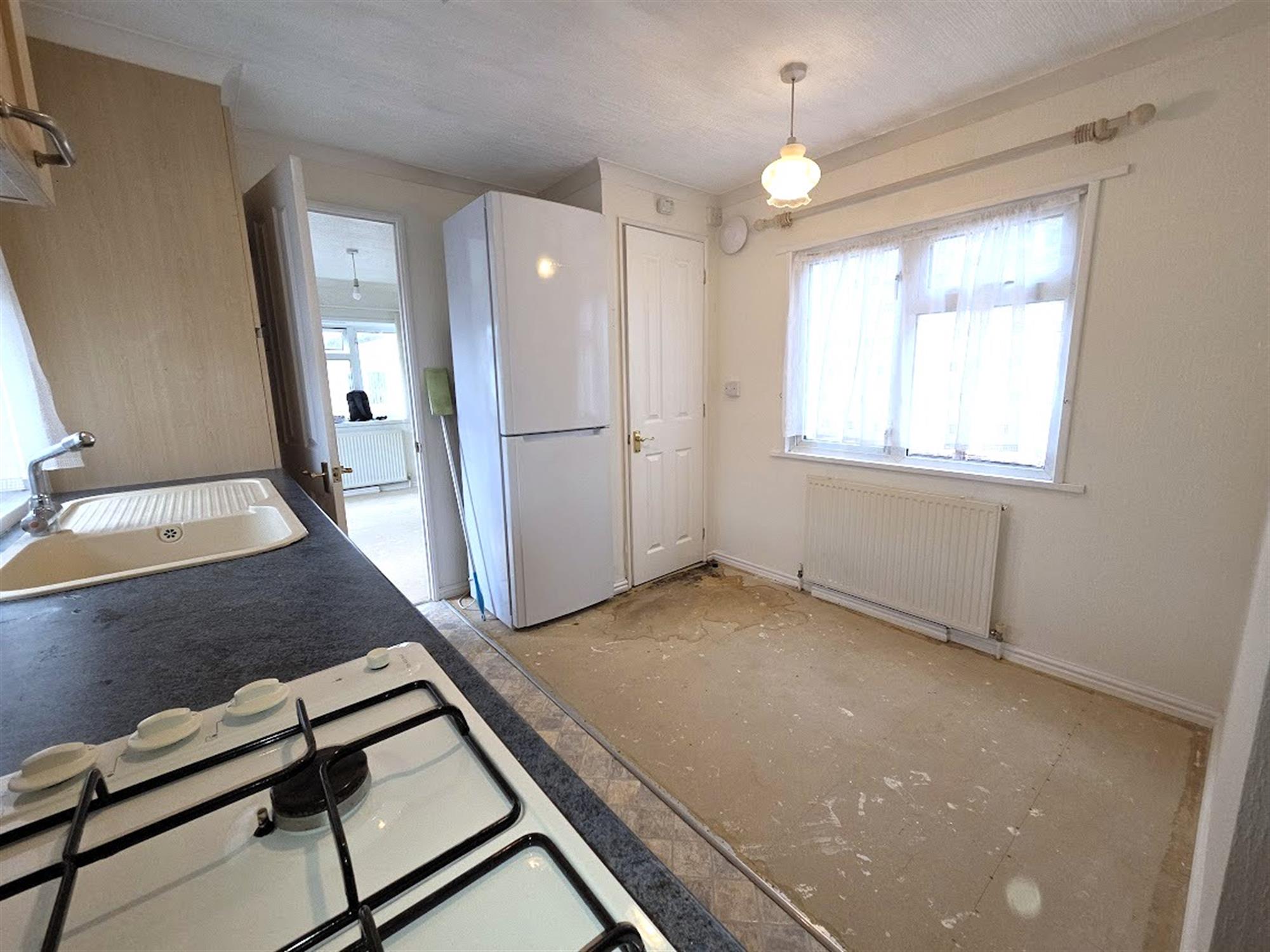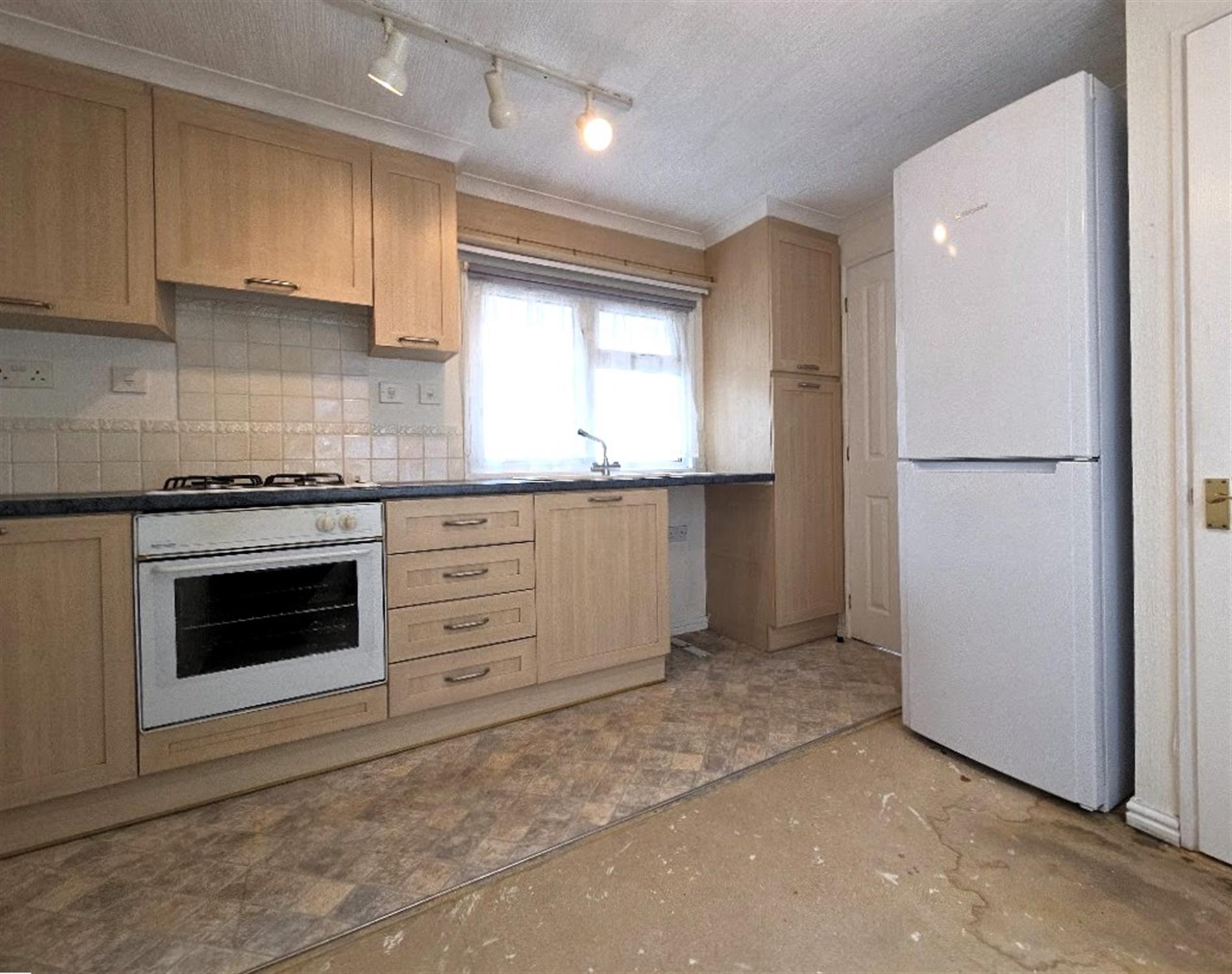 Fitted kitchen with a range of panel fronted wall and base-level cupboards and drawers with work surfaces and inset stainless steel sink with mono bloc tap over, space for gas cooker, automatic washing machine and fridge-freezer, built-in cupboard housing gas combination boiler, servicing heating and hot water, double-glazed windows to both side aspects, space for dining table, door to: