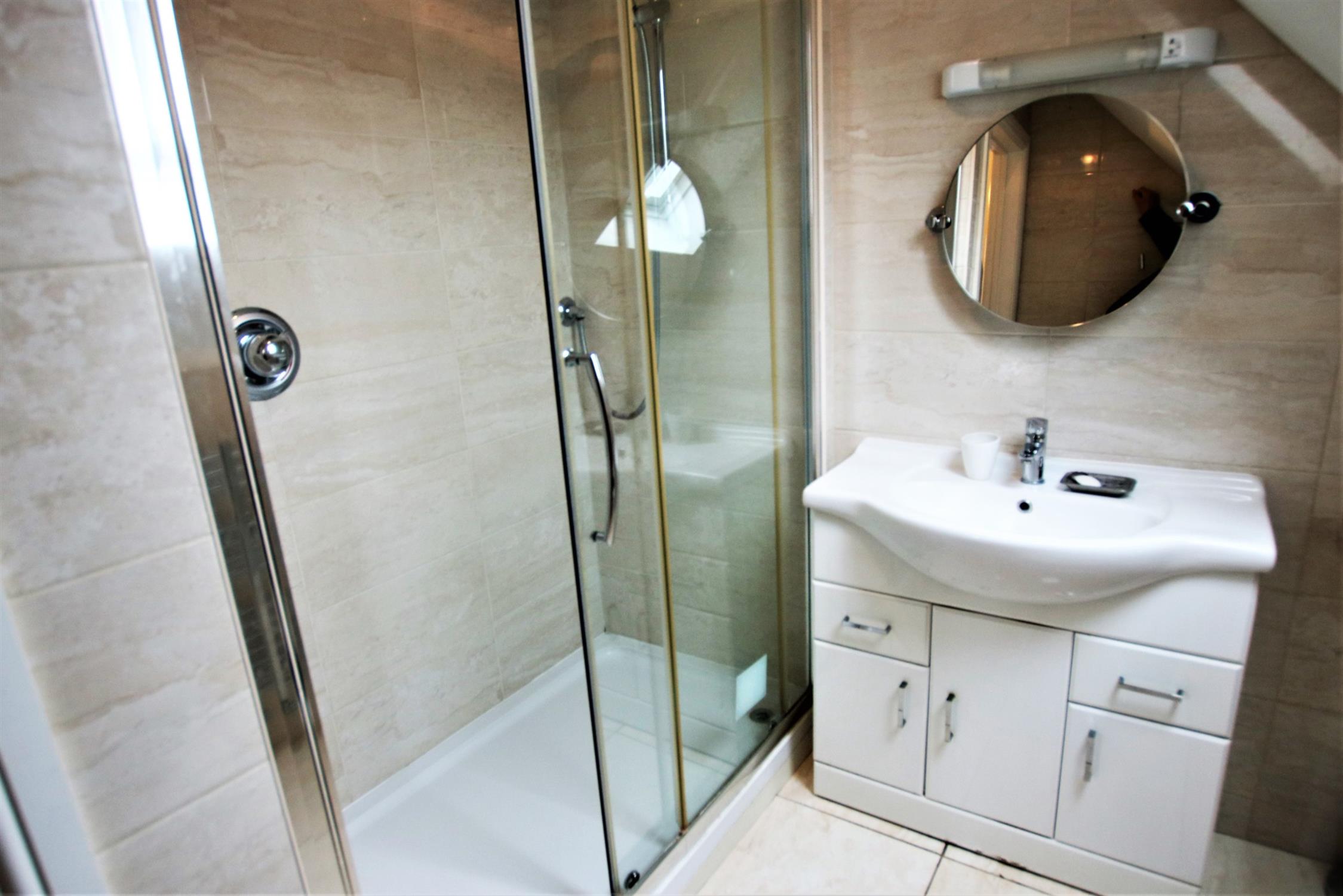 Large walk in shower enclosure with mains fed shoer, tiled wall elevations, vanity housed wash basin with light and shaver point over, low level WC, ceramic tiled flooring, velux window, heated towel rail - radiator.