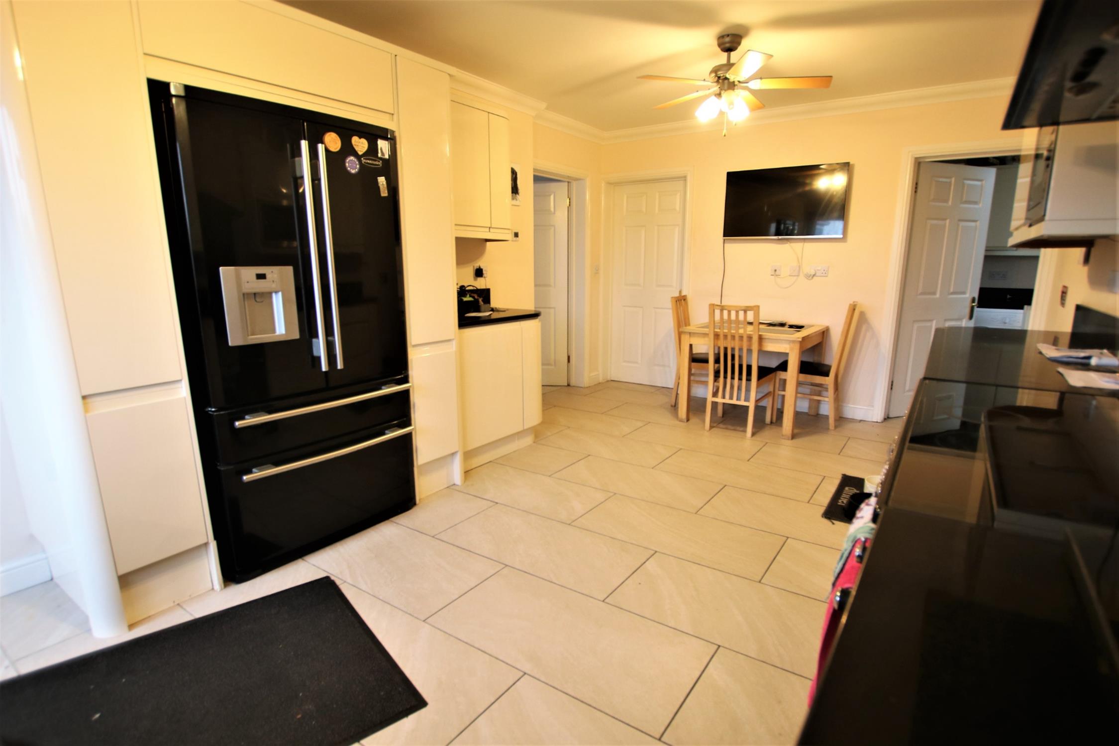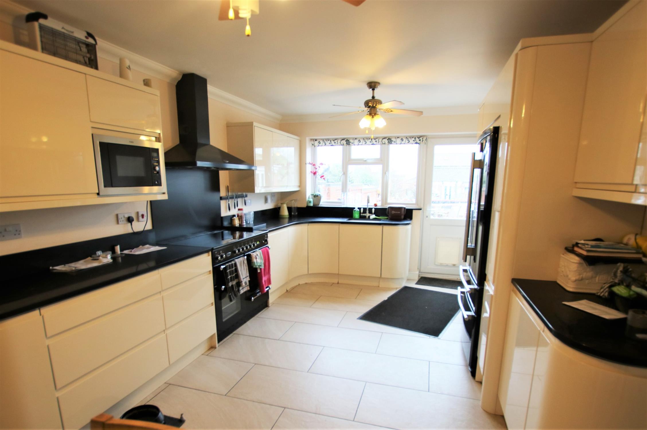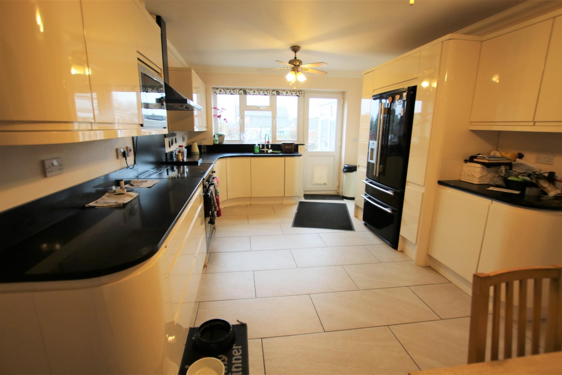 Good range of ivory coloured high gloss eye and base level cupboards and drawers, black quartz atone work surfaces incorporating up-stands, inset sink with mixer tap over, space for range size / style cooker, double-glazed window and door to the rear aspect, ceramic tiled flooring, TV aerial point, space for American style fridge-freezer, space for dining table, door to: