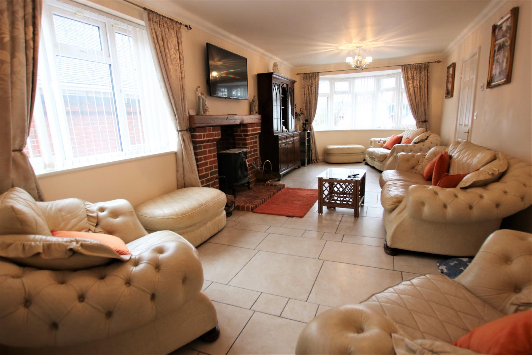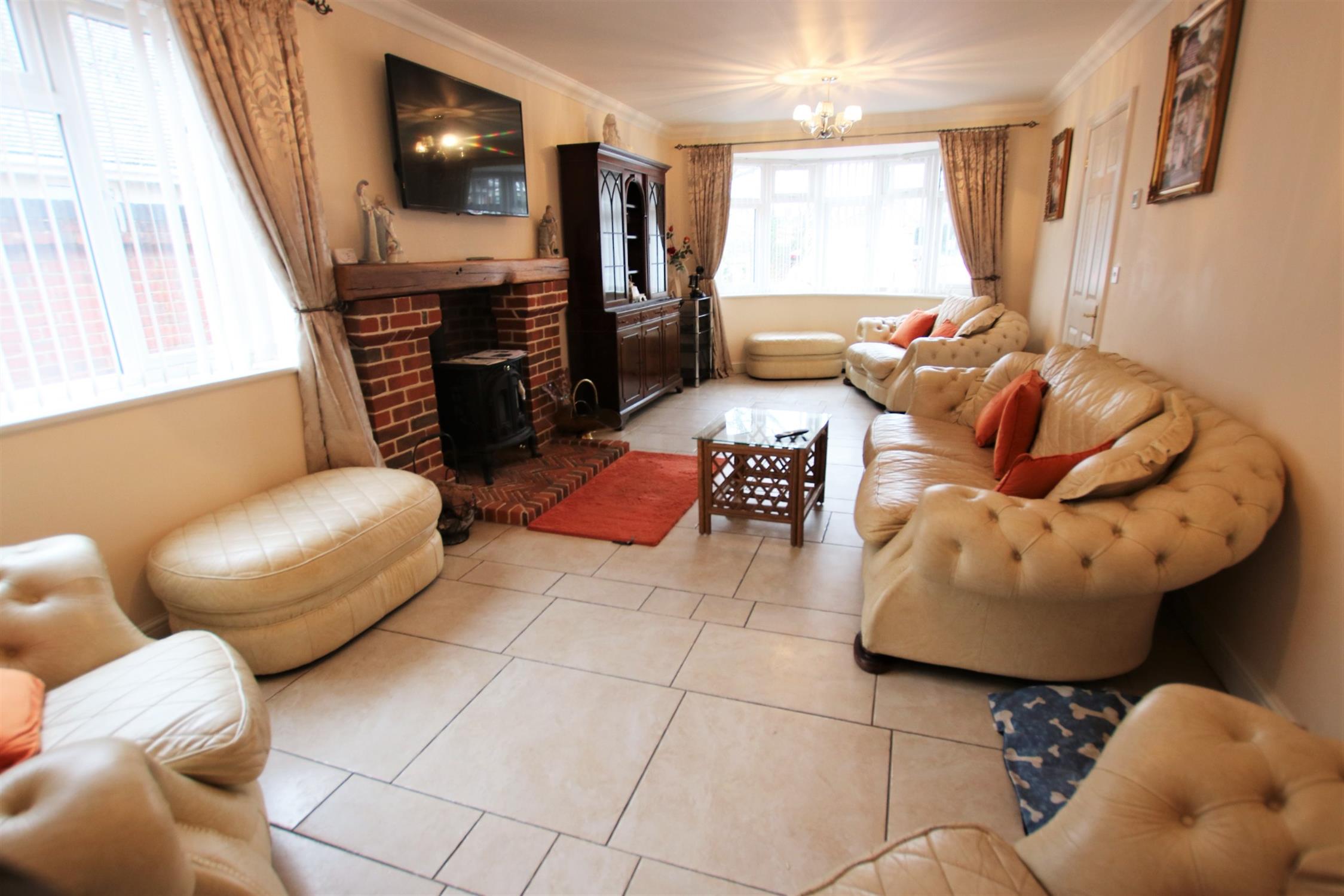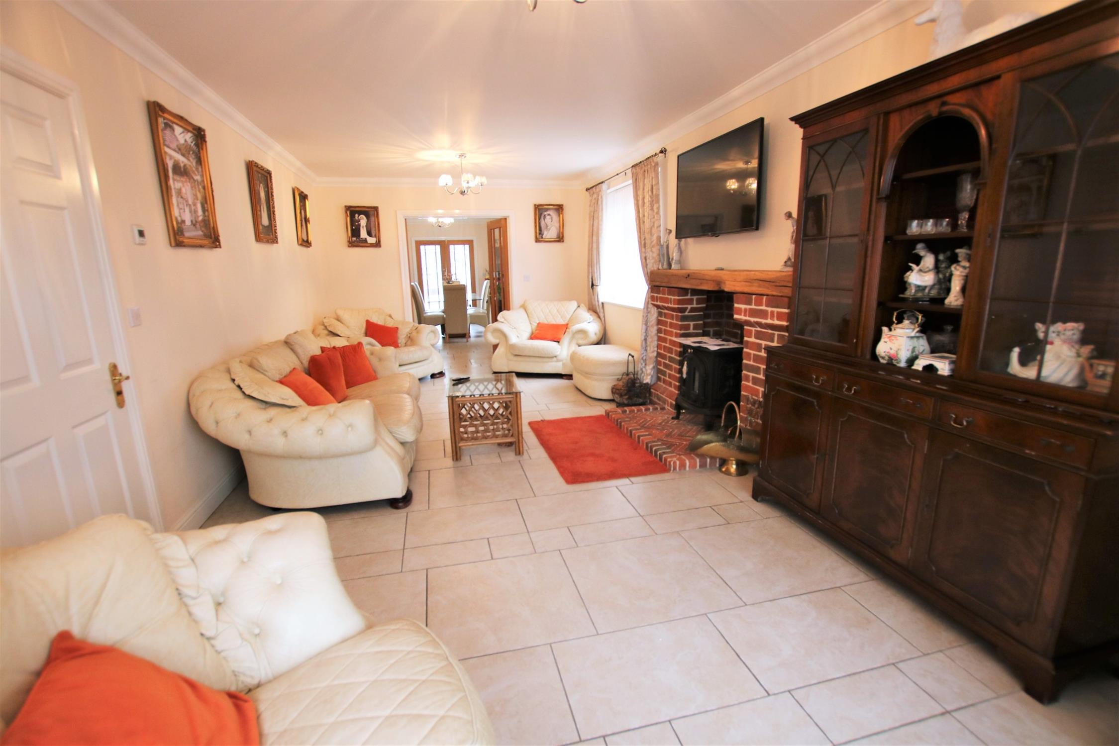 Double-glazed bay window to the front aspect, ceramic tiled flooring open Adams style fireplace brick faced with stone mantel over, inset cast iron log burner, TV arial point, telephone point, underfloor heating, double-glazed window to the side aspect, glazed oak doors to: