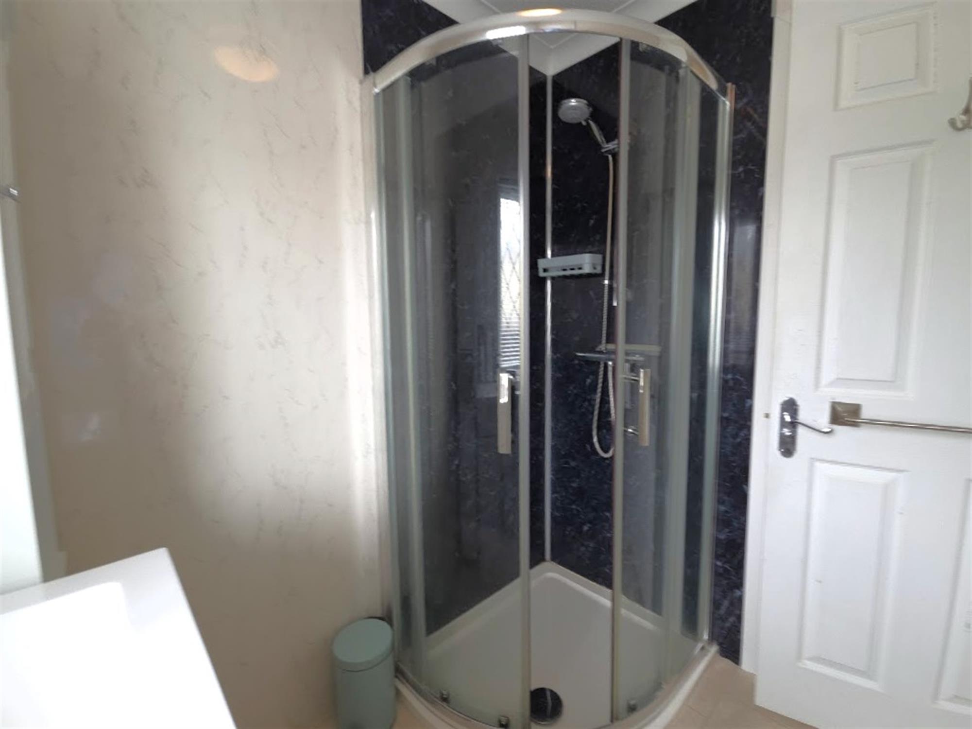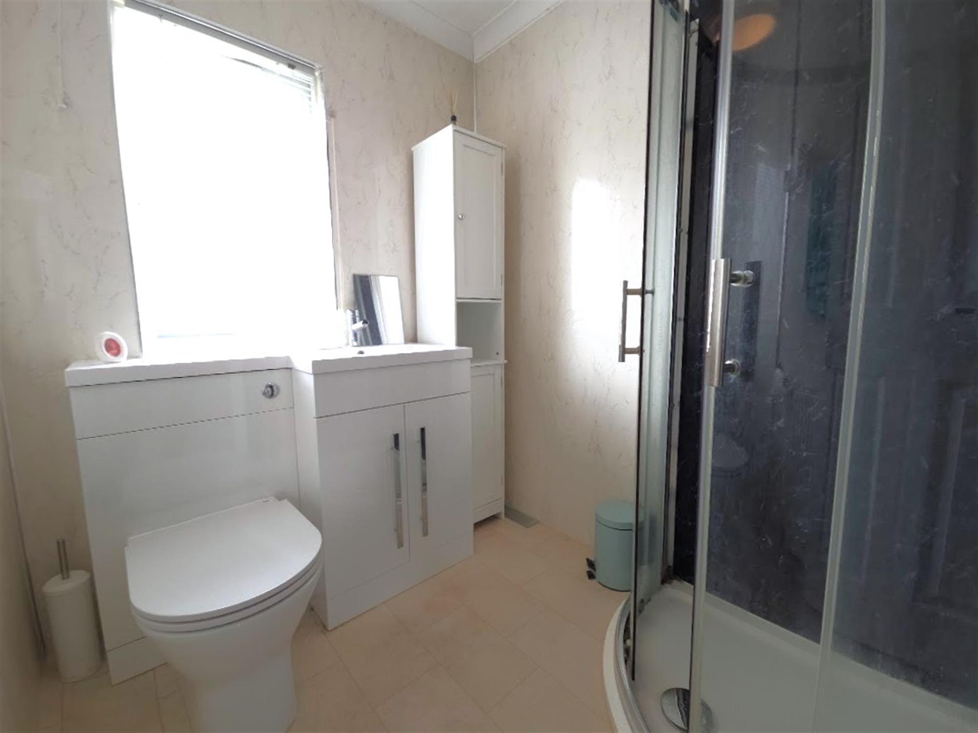 Enclosed walk-in shower enclosure with panel splash backs, vanity housed wash basin with storage under, low-level concealed cistern WC, double-glazed window to the rear aspect, chrome heated towel rail - radiator, tile effect flooring.