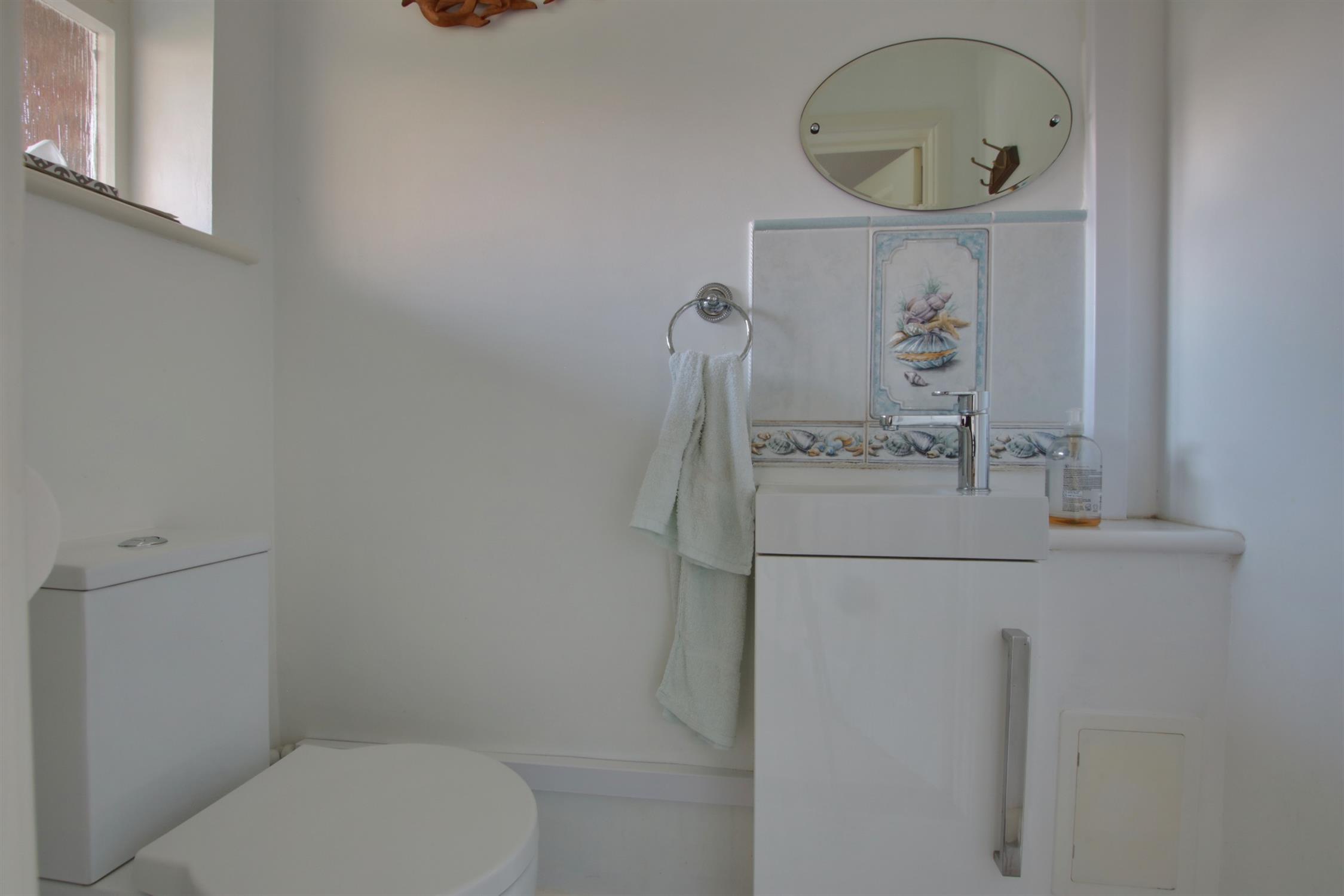 Window to front elevation. Low level close coupled WC. Wash hand basin with storage beneath. Tiled flooring.