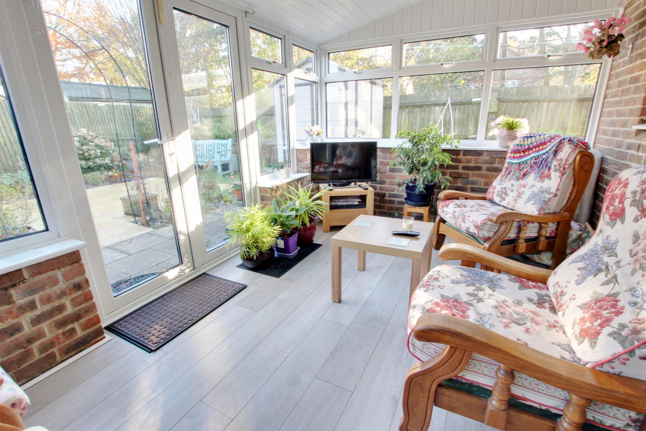 This sunny aspect room is of brick and UPVC construction with tiled and insulated roof. Wood effect laminate flooring. Night storage heater.