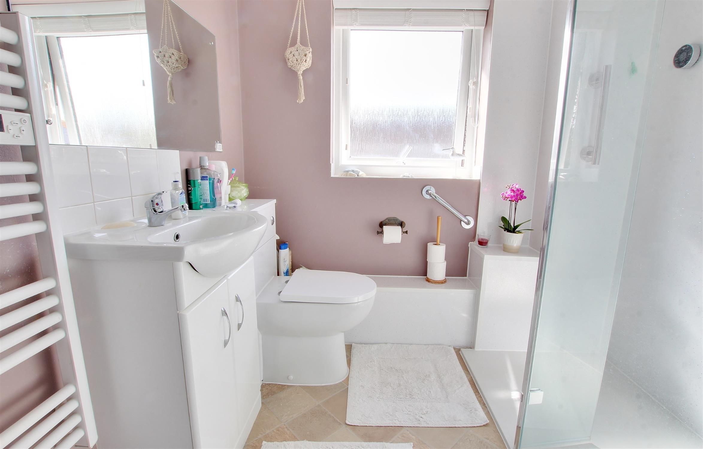 Obscure window to front. Comprising of walk-in shower cubicle. WC. Vanity wash hand basin with cupboard below. Light and shaver socket. Complementary tiling. Chrome heated towel rail.