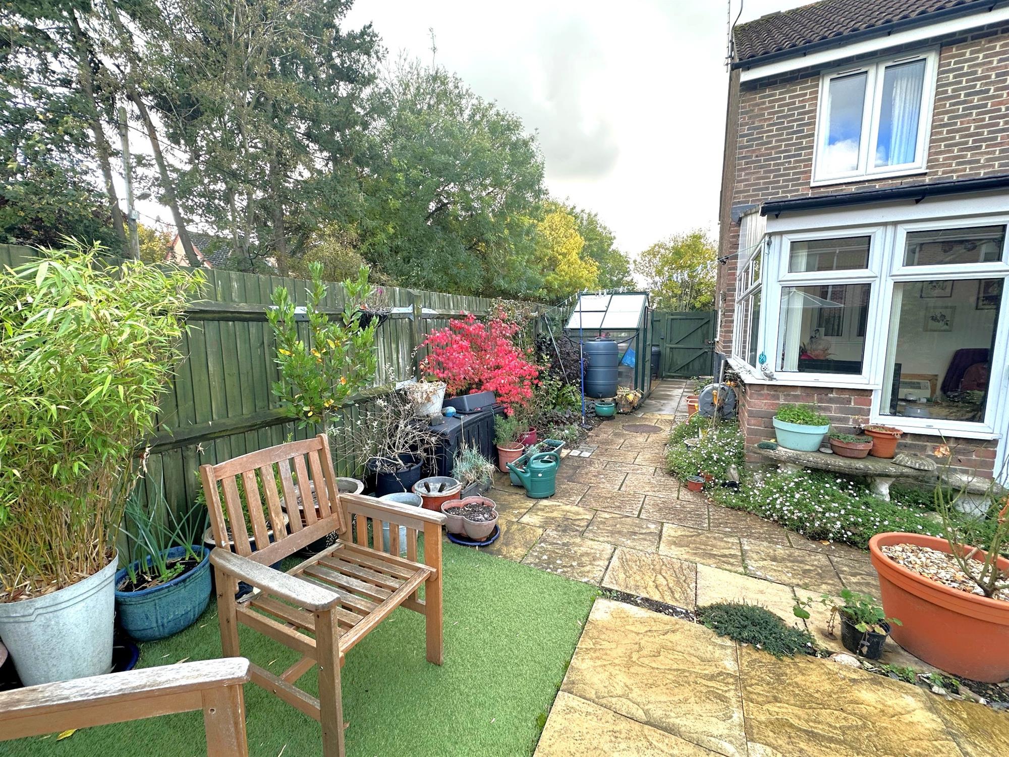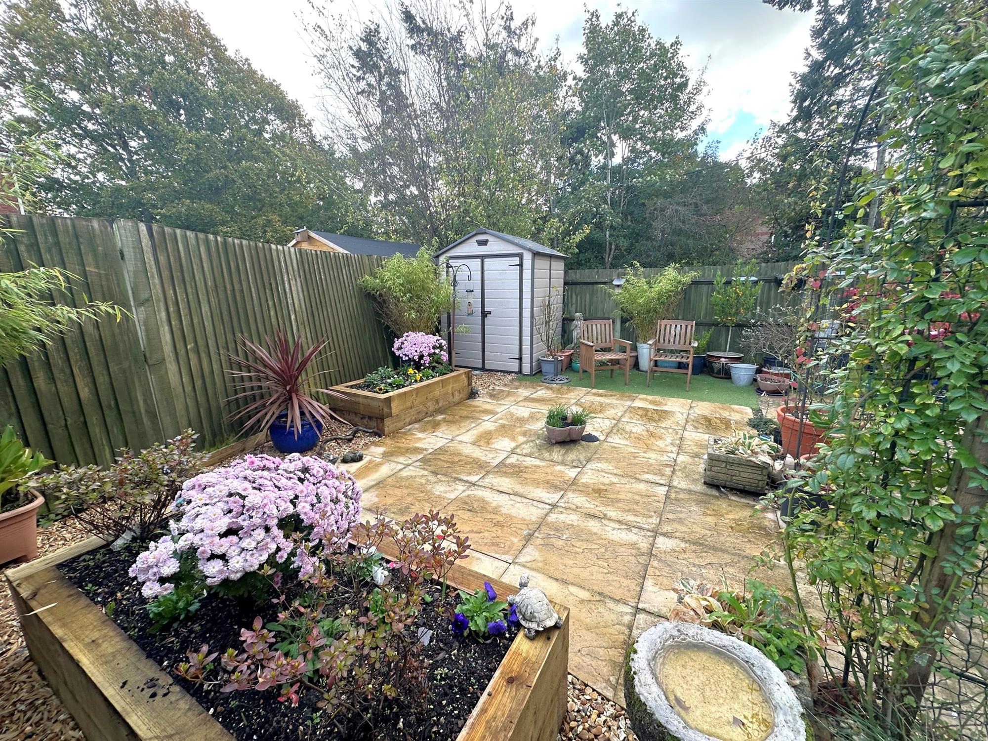 Fenced to boundaries. Patio areas. Artificial lawn areas. Well stocked flower beds. Outside tap.