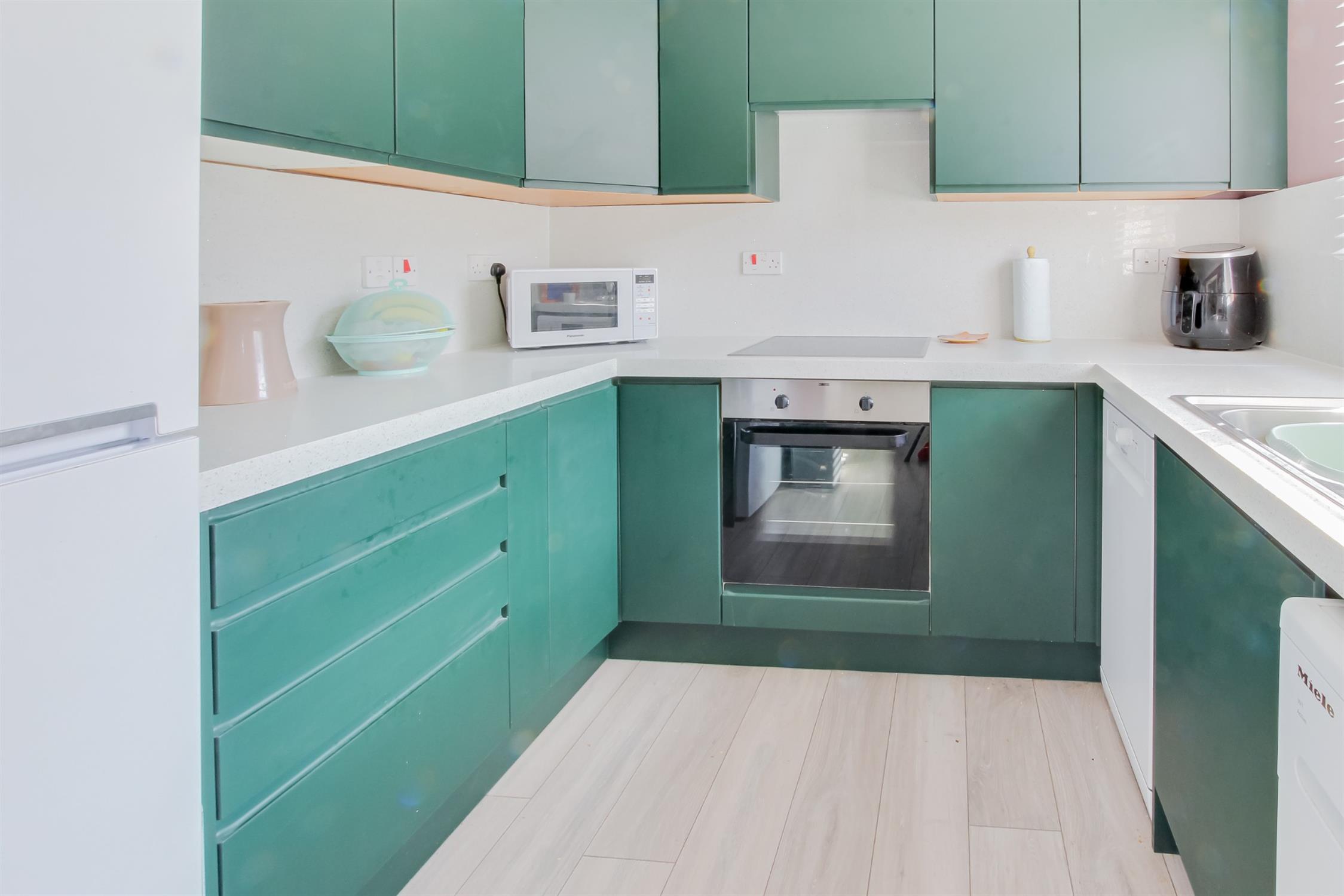 Window to front aspect. Refitted with a comprehensive range of base and wall units and working surfaces over. Inset single drainer stainless steel sink unit with mixer tap. Inset ceramic hob with extractor hood fitted over. Built in oven below. Space and plumbing for washing machine. Space for fridge freezer. Wood effect laminate flooring.