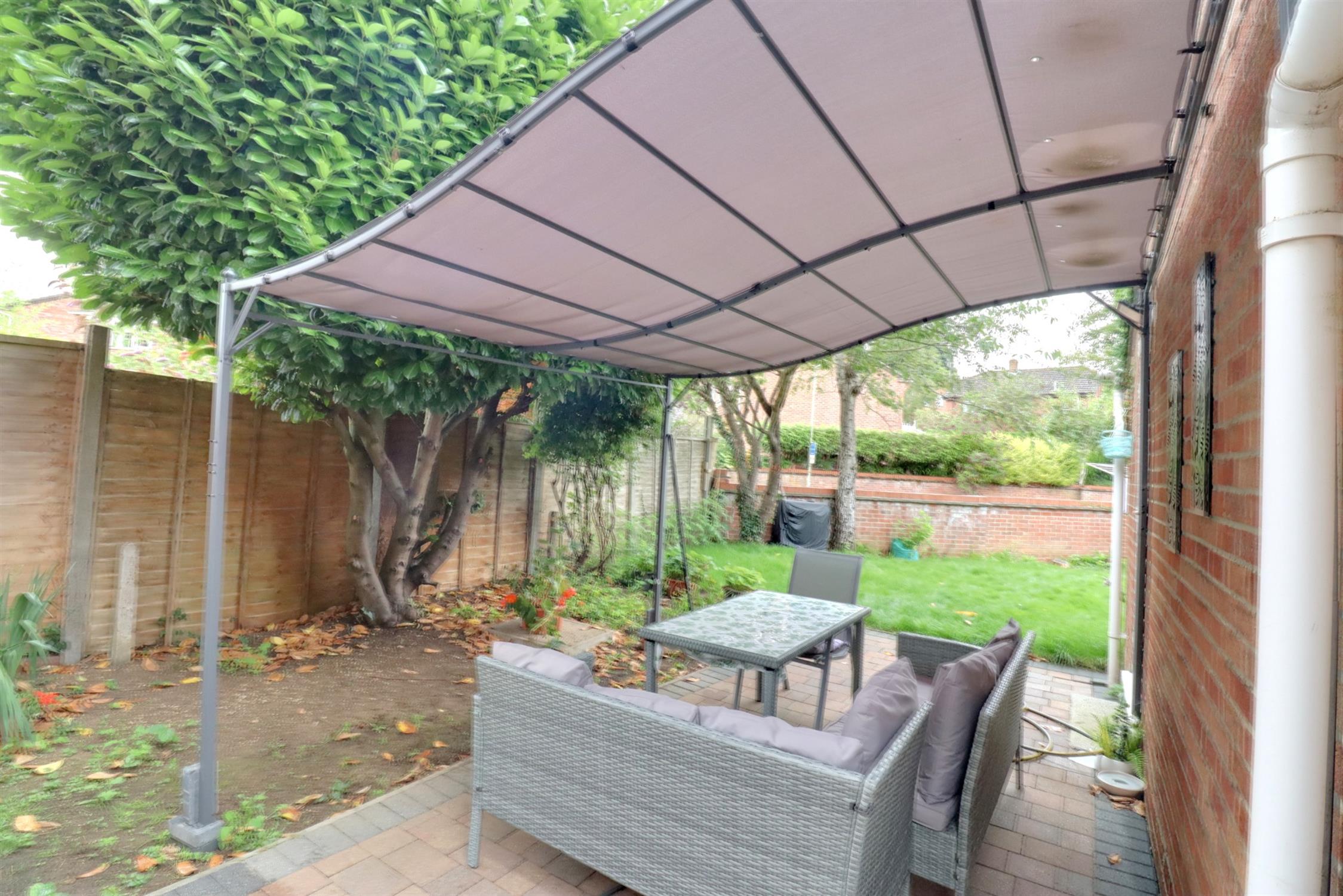 Detached single garage at the end of a tandem driveway. The enclosed rear garden with patio area that wraps around the rear of the garage