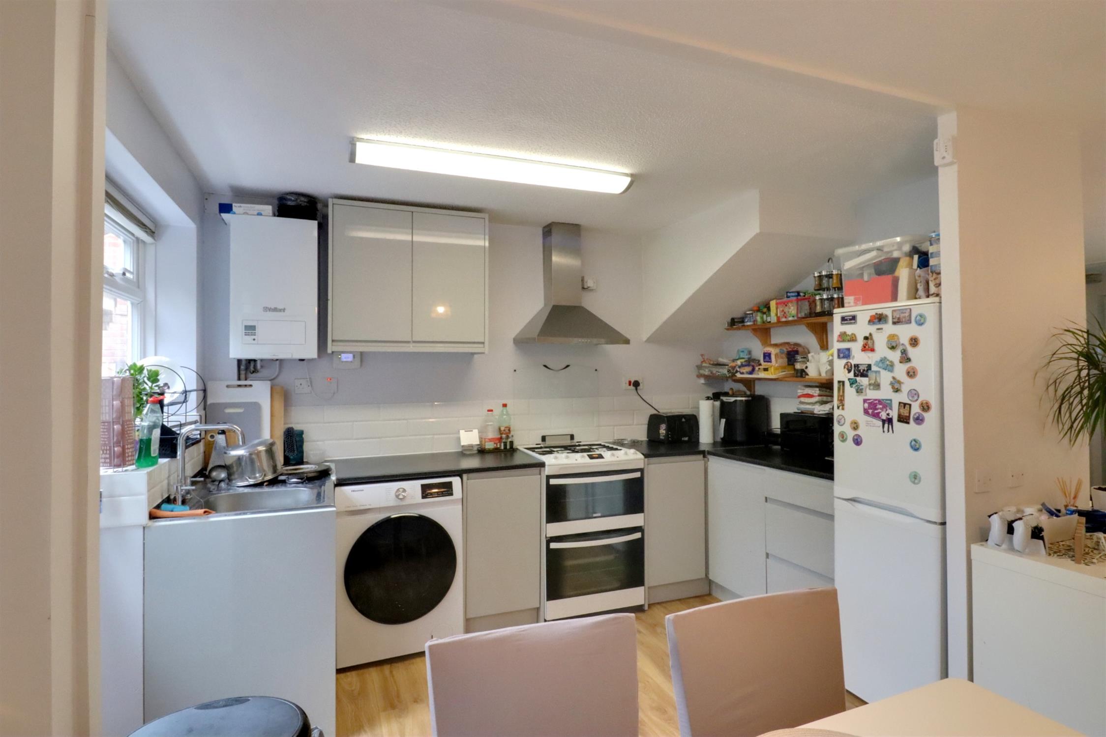 Inset stainless steel sink and drainer. Tiled splashback. Free standing gas cooker with extractor above. Space for Washing Machine and Fridge/Freezer