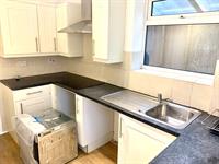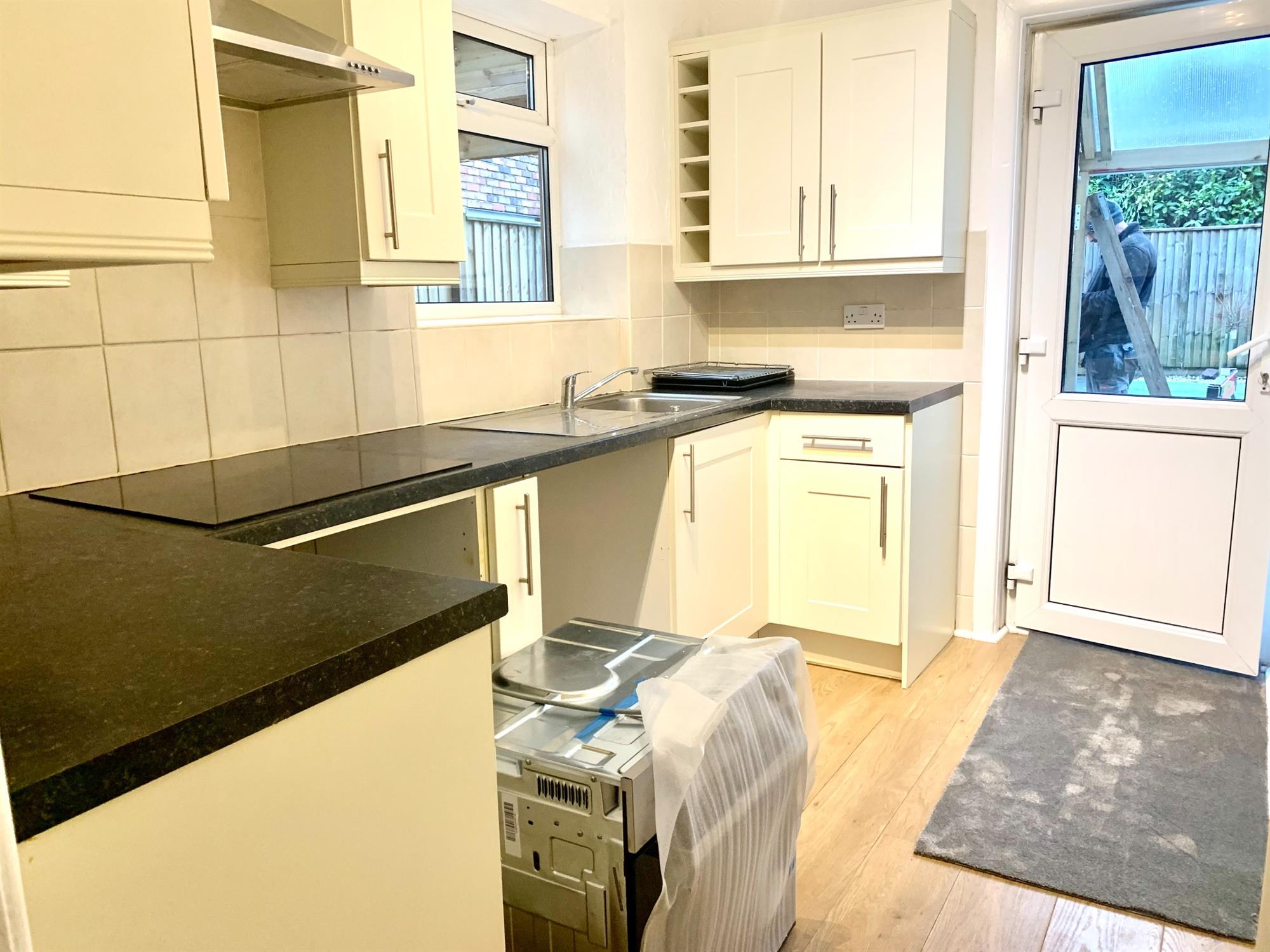 KITCHEN- Cream modern wall and base units. Appliances consist of electric hob, electric oven. Space for washing machine/dishwasher. Window and door to back garden.