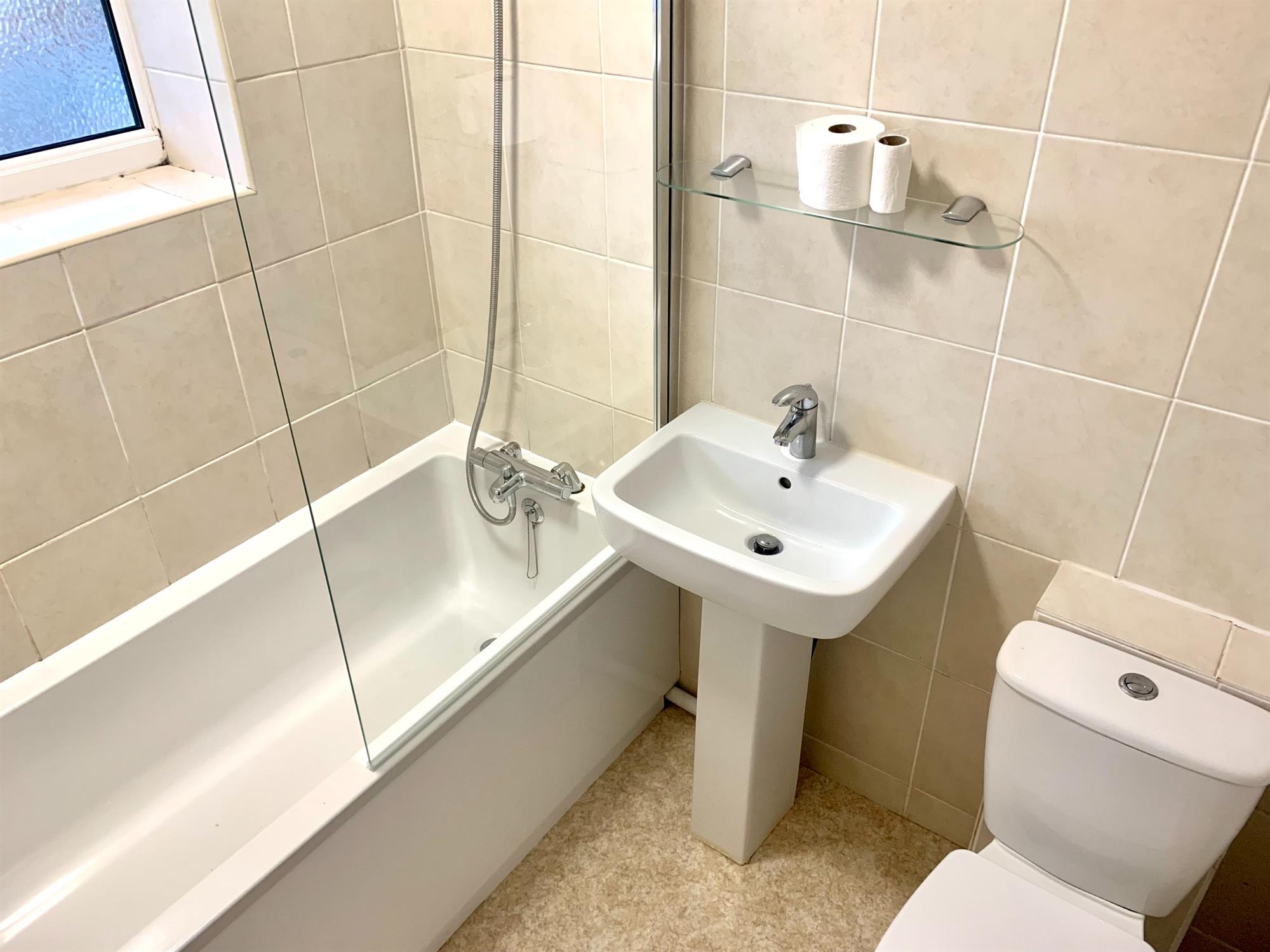 BATHROOM – White suite comprising bath with shower over, sink and basin. Window to front.