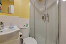 Quadrant shower cubicle. Low level close coupled WC. Pedestal wash hand basin. Electric shaver point. Heated towel rail. Laminate flooring. Extractor fan.
