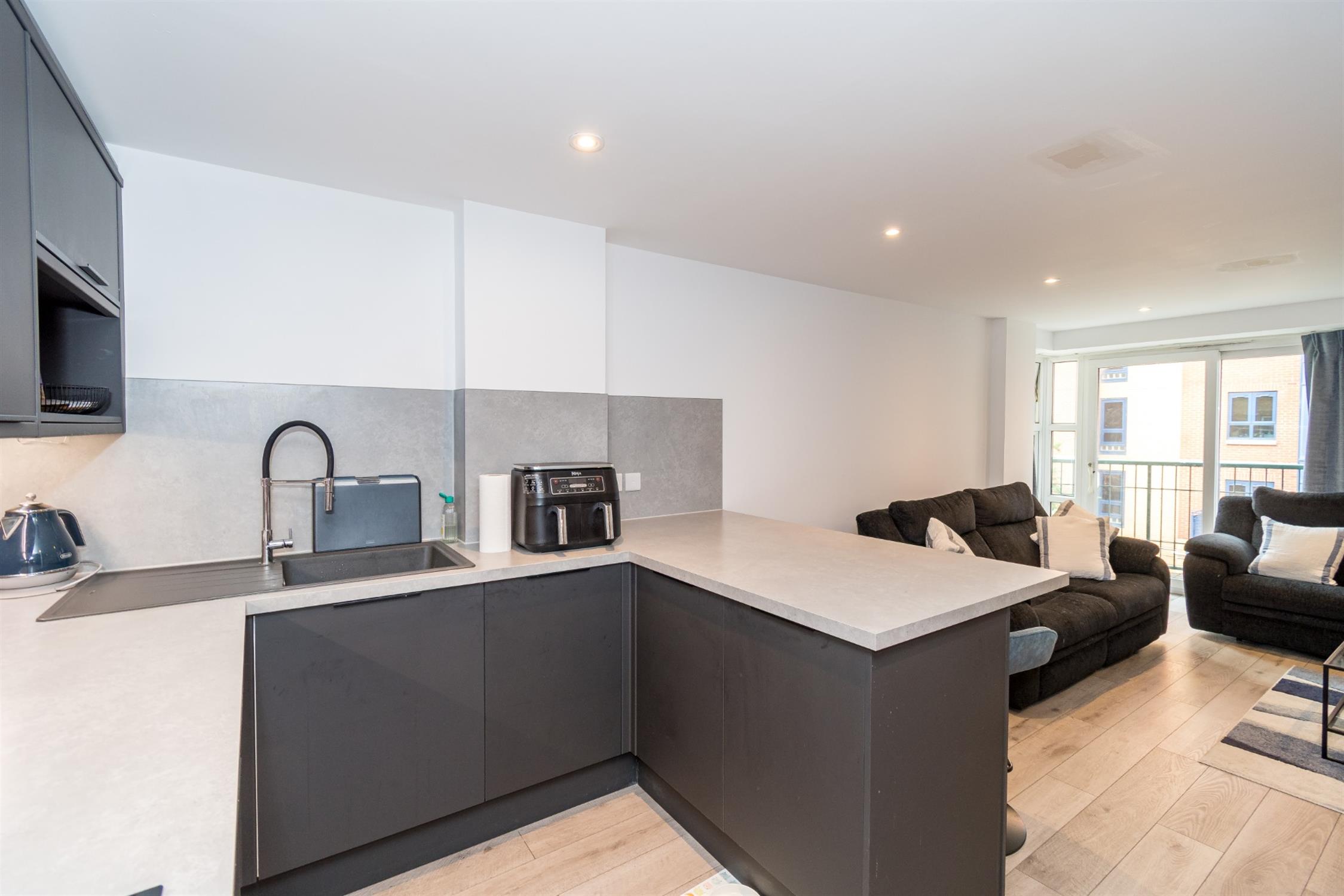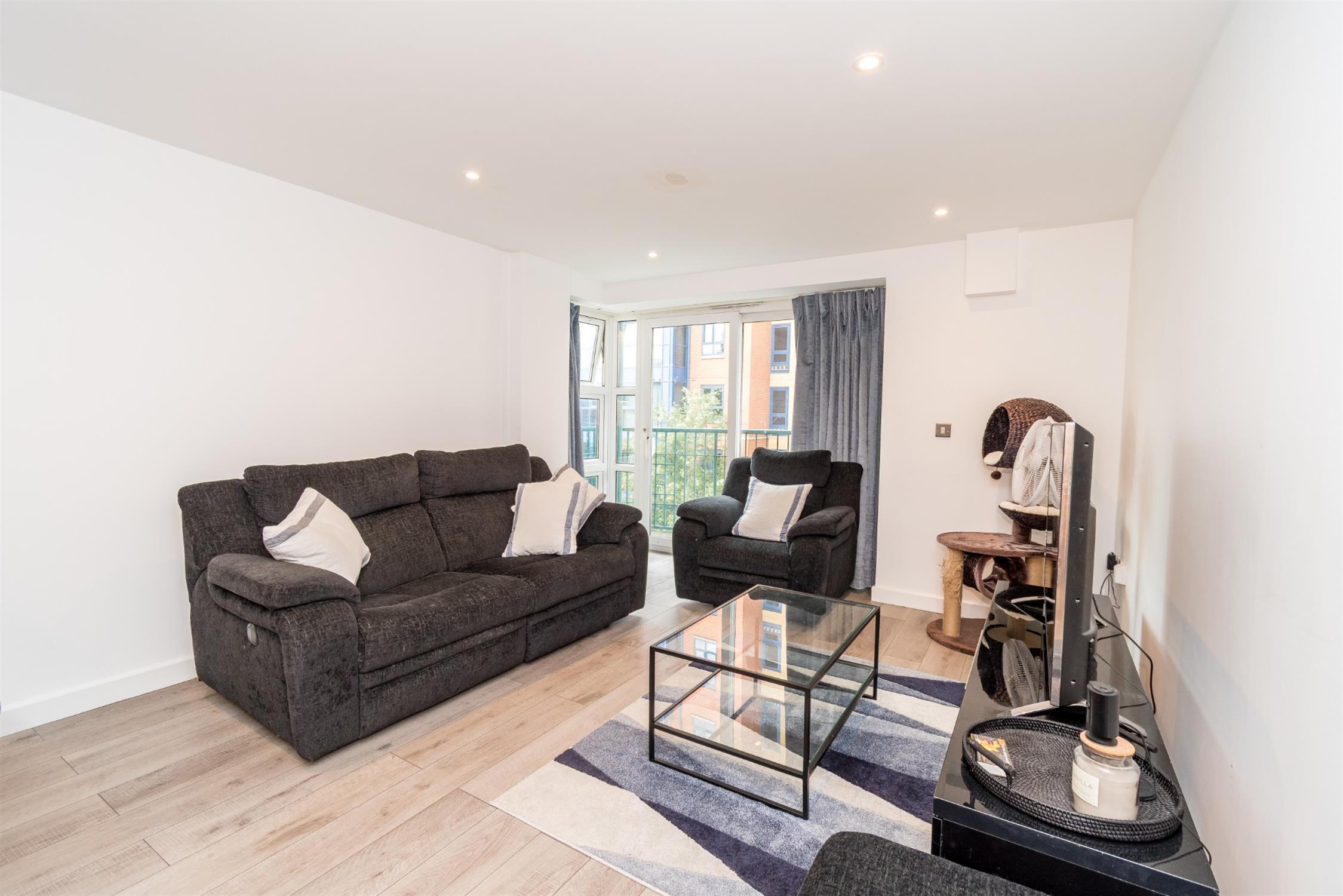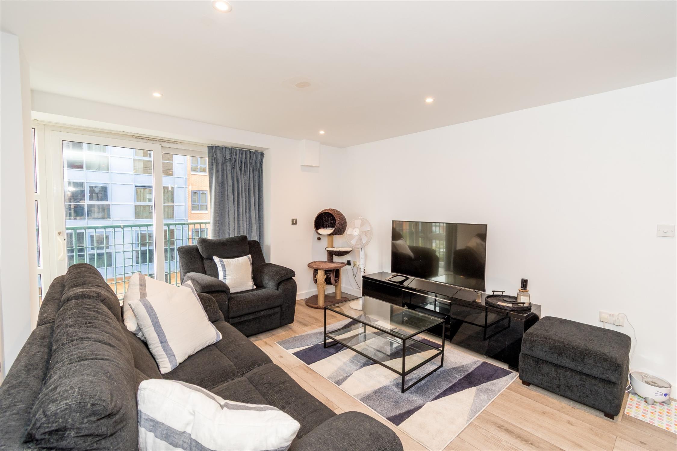 Smooth ceiling, ceiling to floor height double glazed windows with central patio door to the side elevation accessing private balcony, two radiators, thermostat heating controls, range of media points, laminate flooring, opening to: