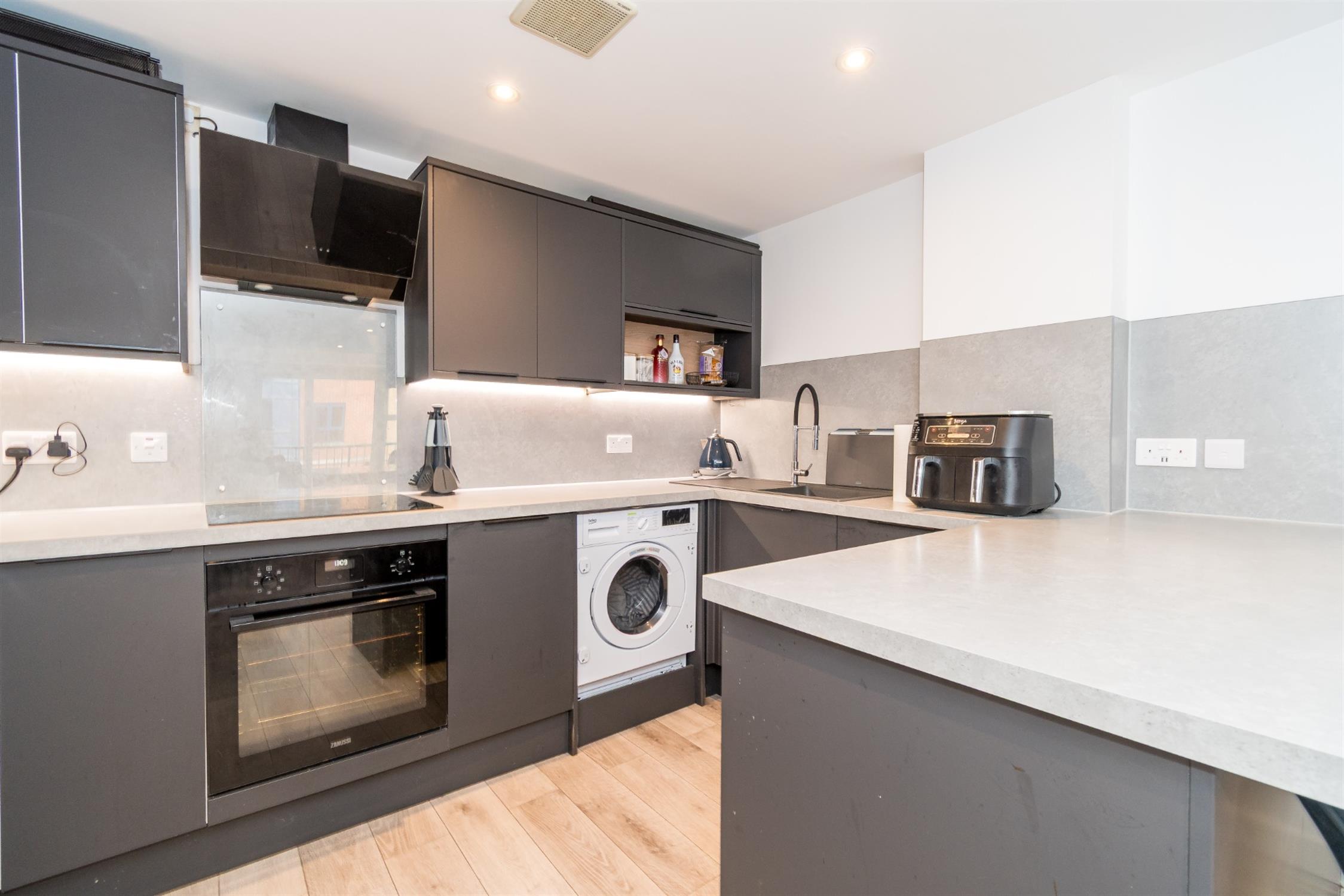 Smooth ceiling with recess ceiling light, extractor fan, modern fitted kitchen with a range of base and wall storage units, roll edge work surfaces inset stainless steel sink and drainer with mixer tap, range of integrated appliances including double oven, electric hob, extractor canopy, slim-line dishwasher, washer/dryer, fridge/freezer, microwave grill oven, laminate flooring, tiled splash backs.