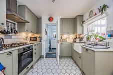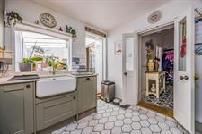 Smooth plastered ceiling, a complimentary range of wall mounted and base level units with roll edge worktop. Butler Sink, with tiled splashback, integrated appliances, extractor, gas hob and oven, tiled flooring. Door to;