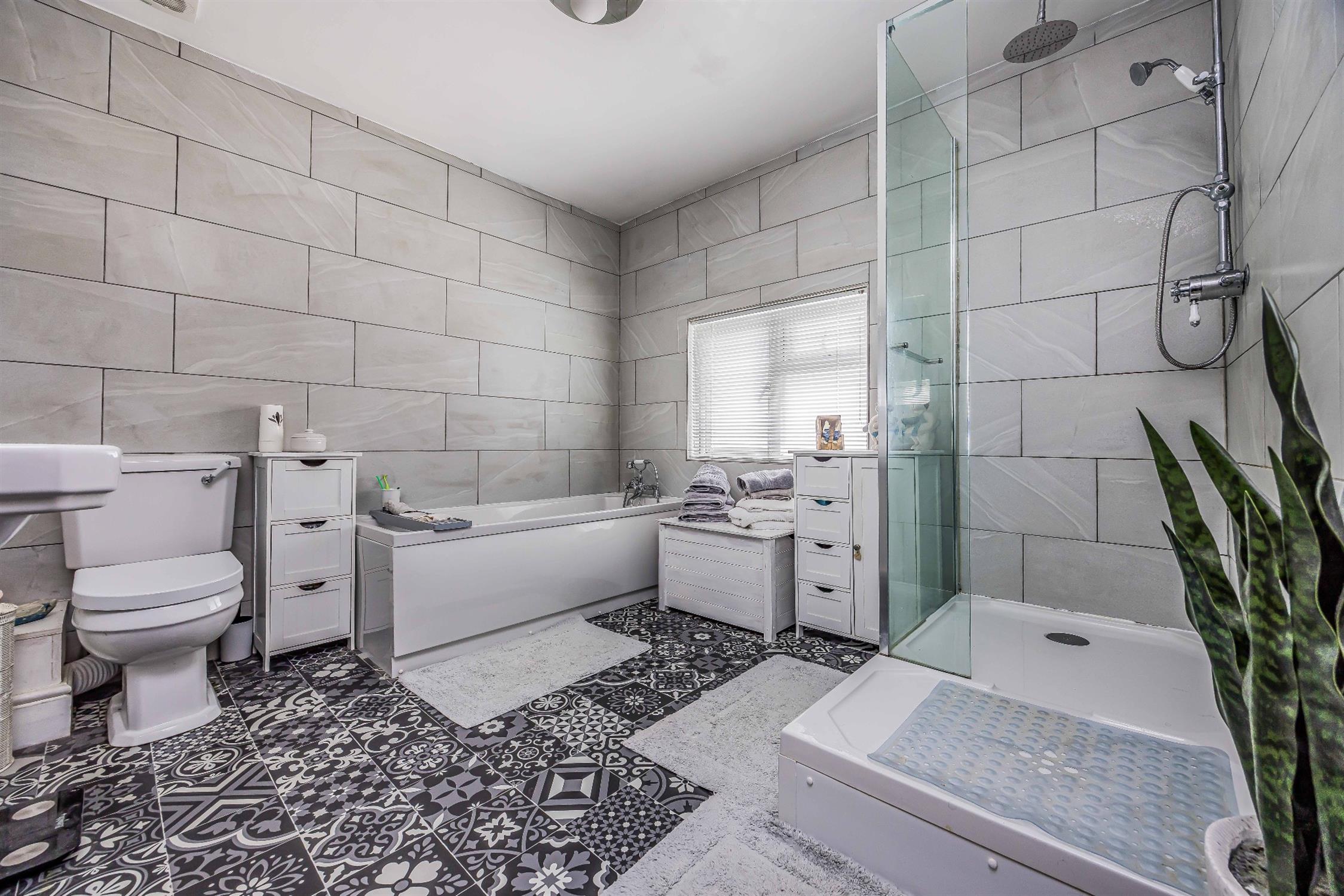 Smooth plastered ceiling, double glazing, a spacious modern four piece bathroom suite comprising; low level WC, ceramic sink, bath tub with mains shower head over, shower cubicle, extractor, tiled throughout.