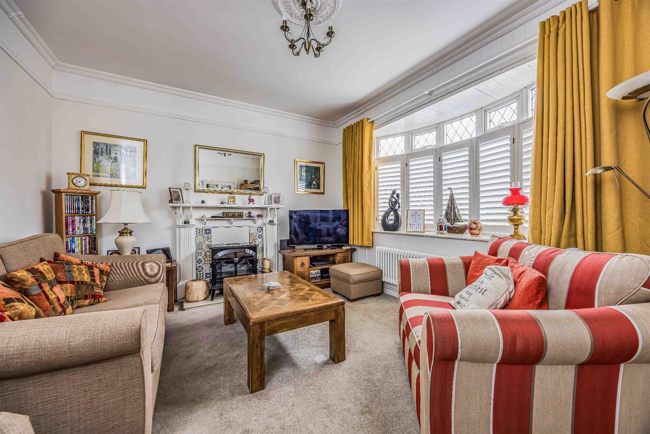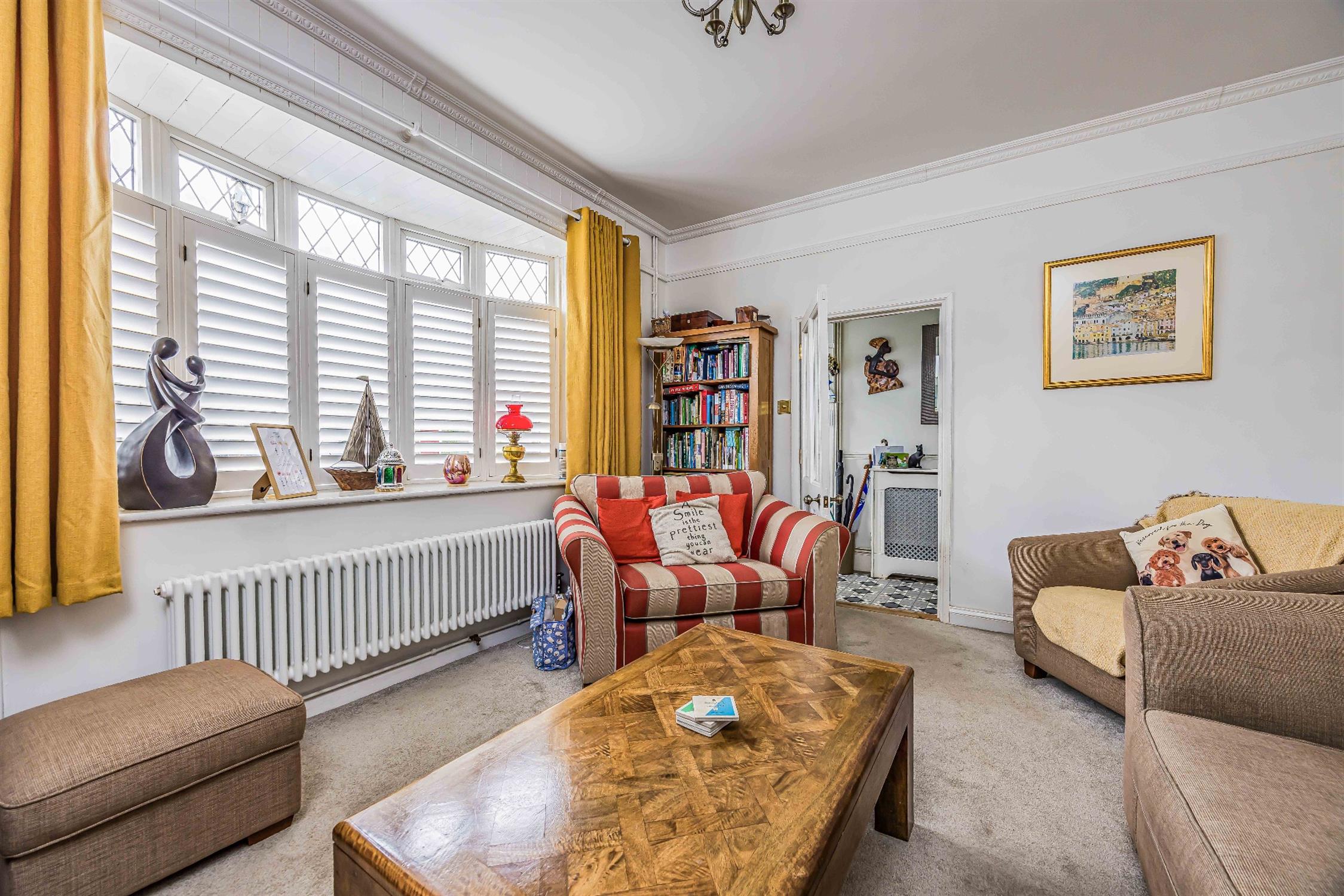Smooth plastered ceiling, double glazing, coving, picture rails, feature fireplace, radiator, carpeted flooring.