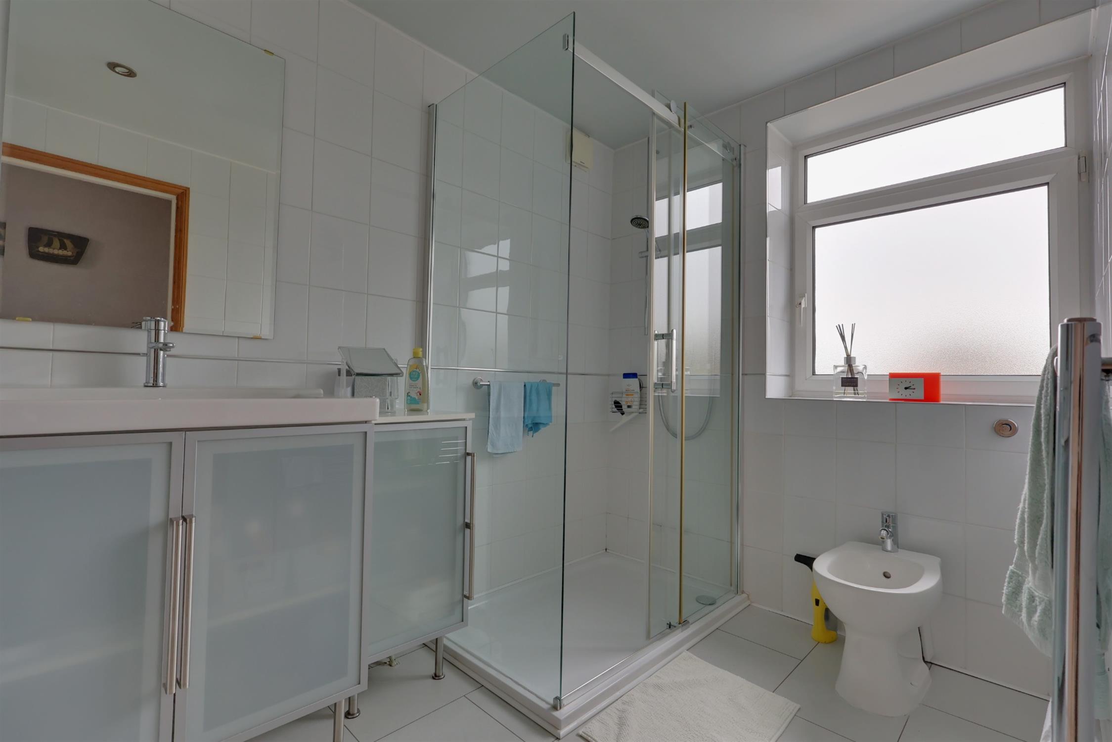 The modern shower room features a walk-in shower, a bidet, a vanity wash hand basin, and a towel rail. The tiled walls and floor add a sleek and contemporary finish.