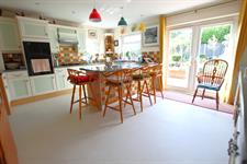 KITCHEN/BREAKFAST ROOM Double glazed windows to rear garden offer twin aspects to side and rear and French doors opening to patio and rear garden, fitted shaker style kitchen with a generous selection of wall and base units with work surfaces extending to 2 x breakfast bars, 1 1/4 sink and drainer with mixer taps, integral double oven with 4 ring gas hob and concealed extractor fan over, concealed appliances include under unit fridge, dishwasher and renewed combination boiler, power points, 2 x radiators, power points, new vinyl flooring, door to