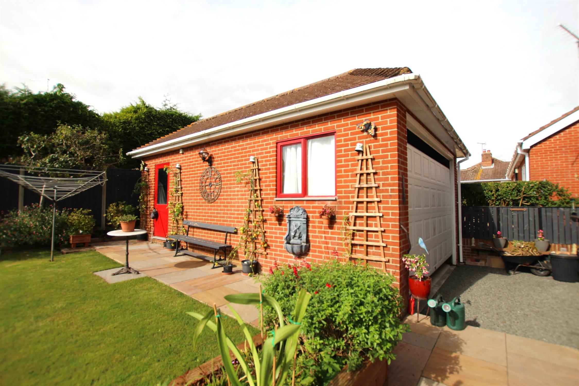 DETACHED GARAGE Oversized with clearance height for storage of a motorhome / Caravan internally. Power and light, personal door to garden, eaves storage. Potential garage conversion to self-contained flat/annex.