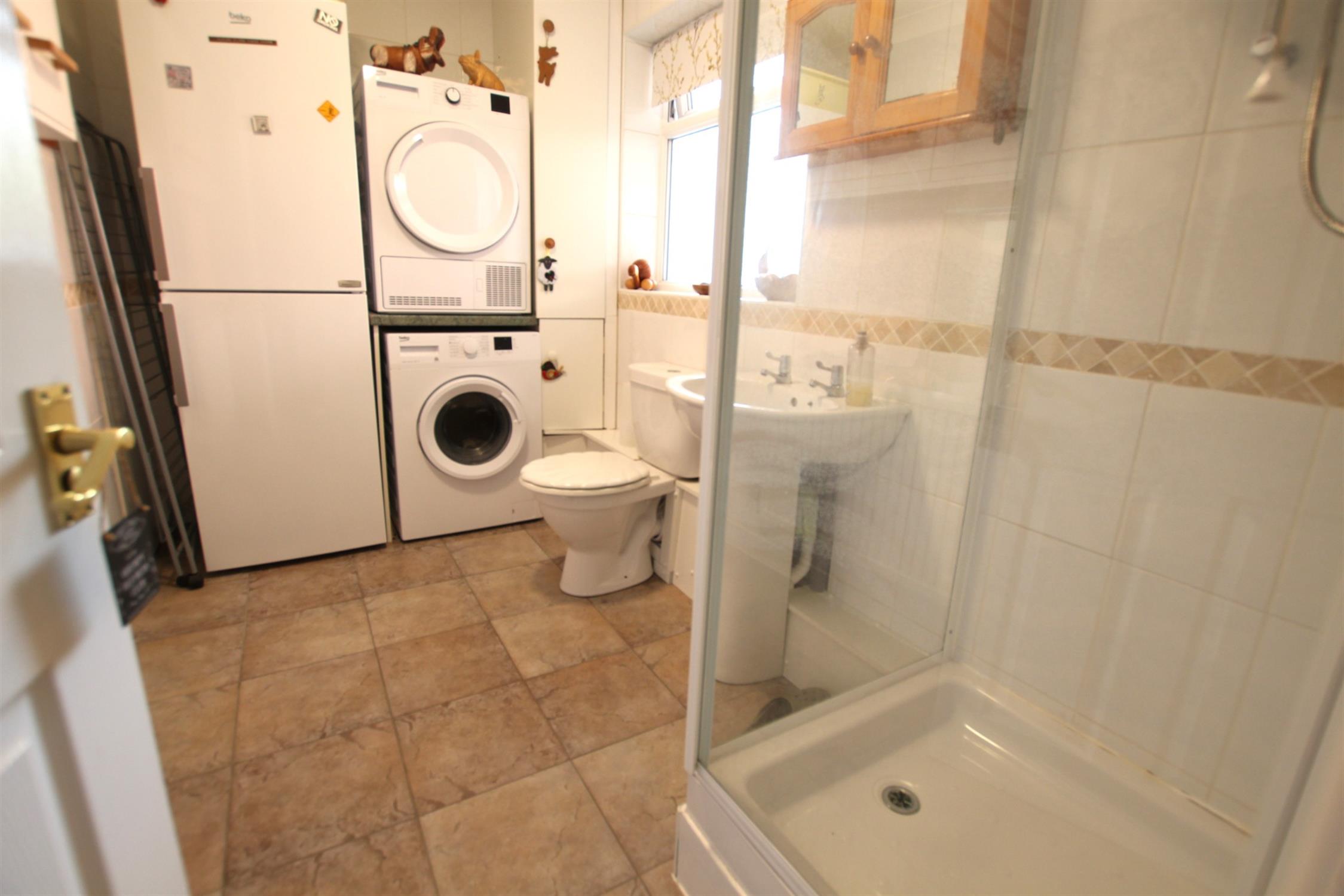 SHOWER/CLOAKROOM/UTILITY Obscured double-glazed window to side elevation, three piece suite offers enclosed and tiled shower cubicle, wash basin and WC, utility area with work surface with space below for washing machine and tumble dryer and fridge/freezer , radiator, power points, tiled walls and flooring, extractor.
