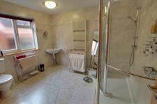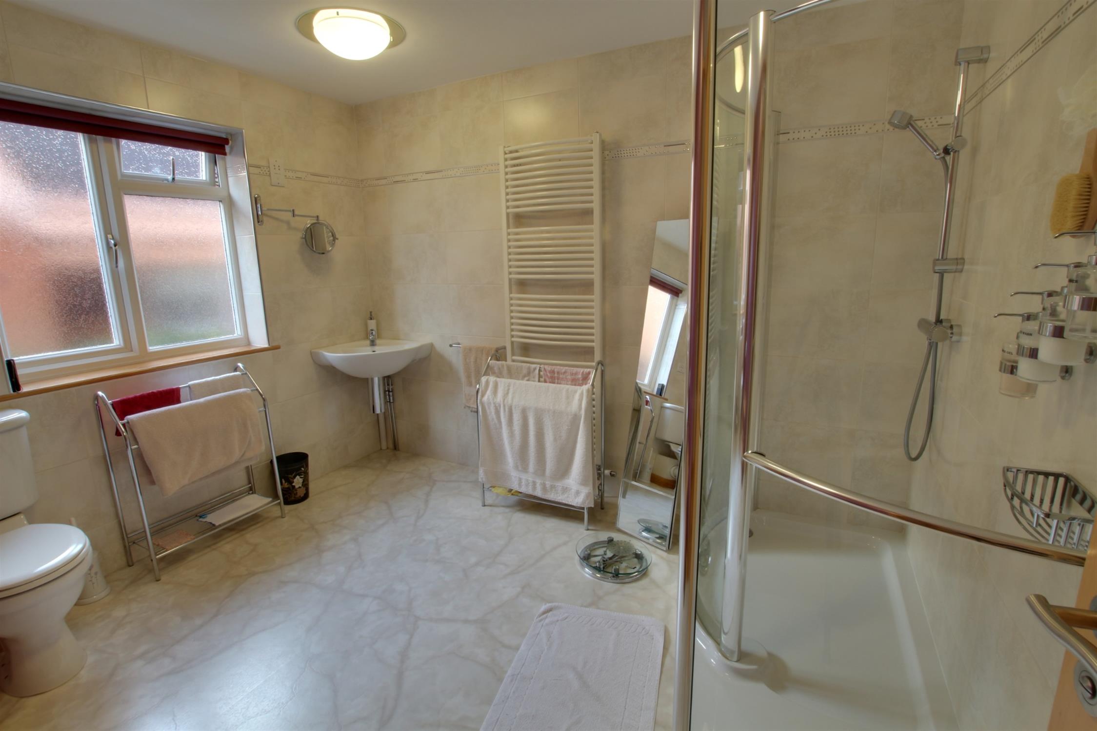 Obscured double-glazed window to side elevation. Walk-in double shower with tiled surrounds. Low level W.C. Corner sink unit with mixer taps. Airing cupboard and further corner storage cupboard. Ladder style radiator. Extractor.