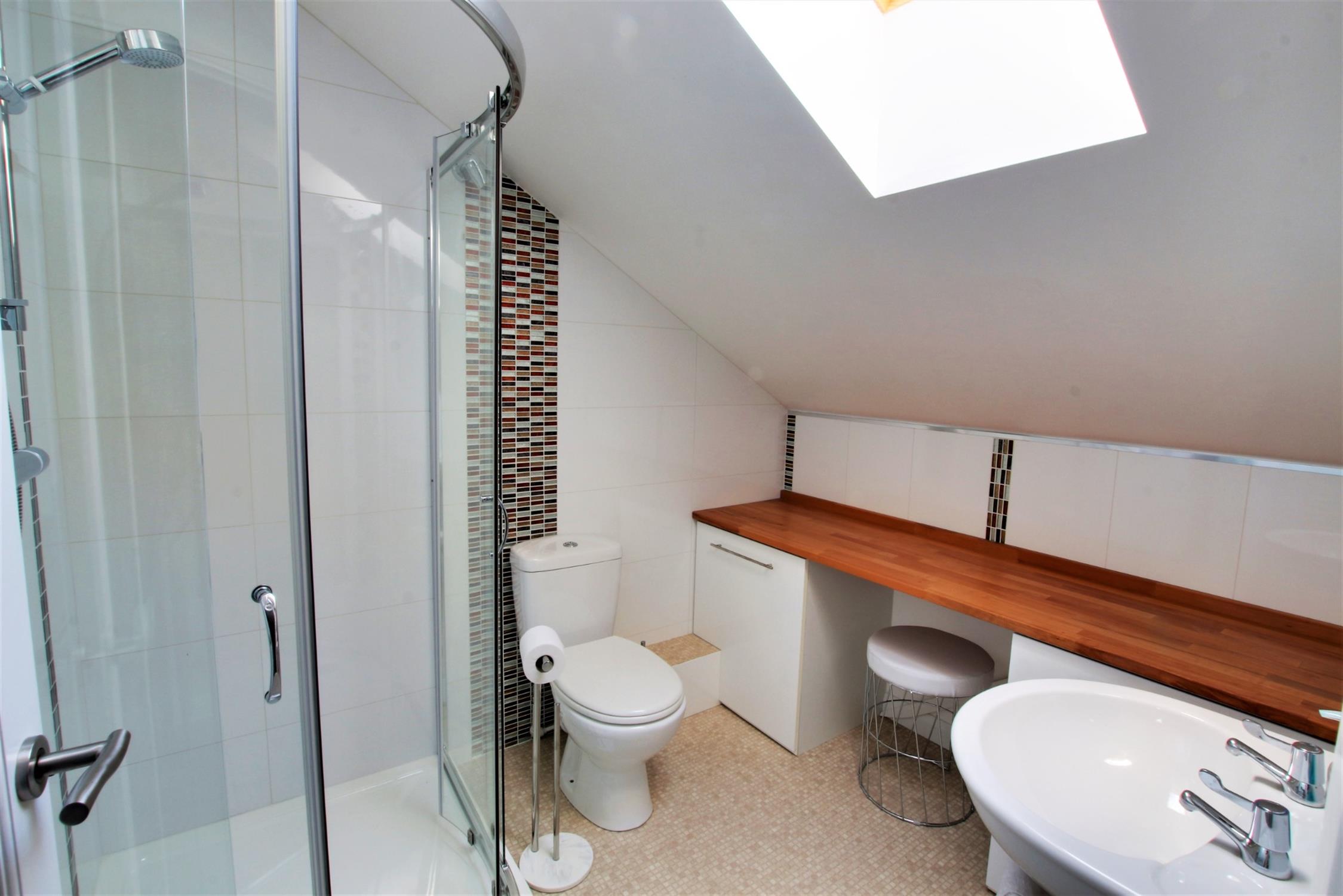 Double glazed Velux window to rear elevation. Step in corner shower, tiled and with glass door and screen. Low level W.C. Wash basin in vanity surround with beech block surface. Tiled wall surrounds, ladder style radiator, extractor, electric shaver point.