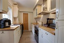 Double glazed door leading to the rear garden. Double glazed window to the side aspect. Smooth ceiling. Matching wall and base units with wooden worktops. Tiled splashback. Space for cooker with extractor above. Integral fridge/freezer. Space for washing machine and slimline dishwasher.