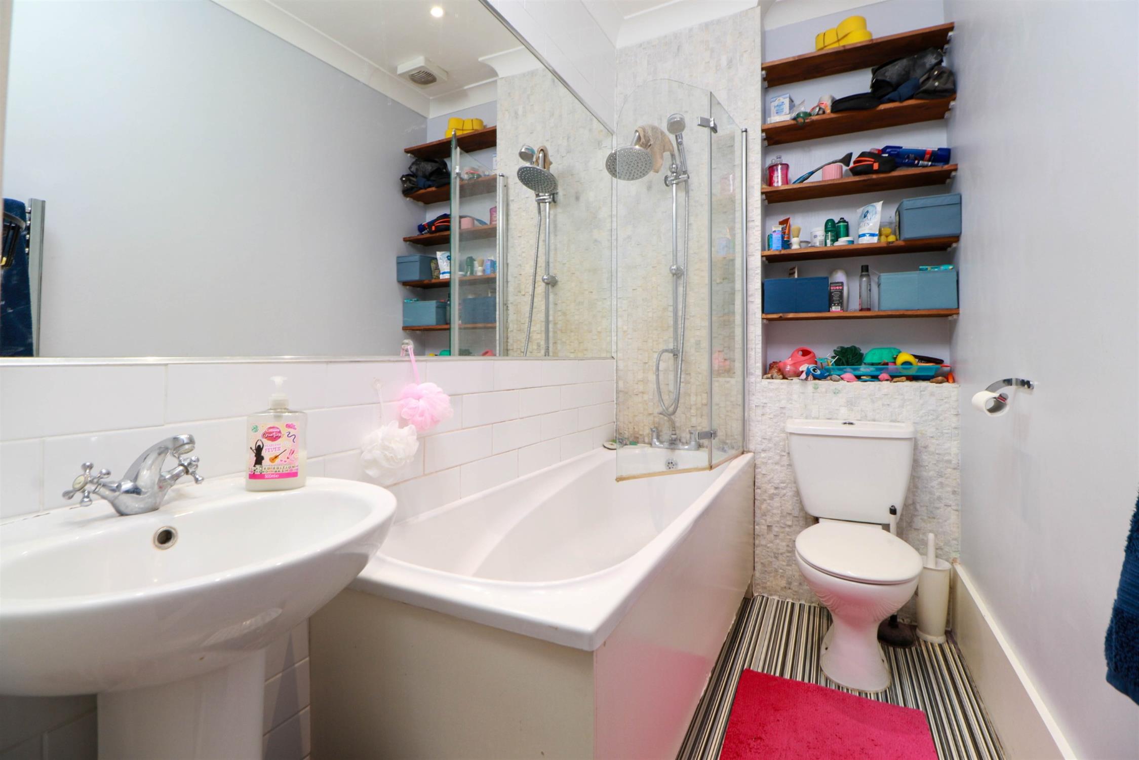 Extractor fan, inset spotlights, panelled bath with mixer shower over and screen, WC, pedestal wash hand basin, ladder radiator, wall mounted mirror, part tiled walls, vinyl flooring.