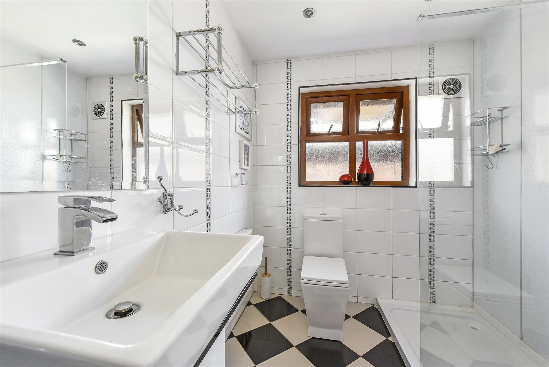 Fully tiled. Step in double shower. Wash basin with vanity mirror over. Low level W.C. Inset ceiling lighting. Obscure double glazed window to side. Airing cupboard with hot water tank.