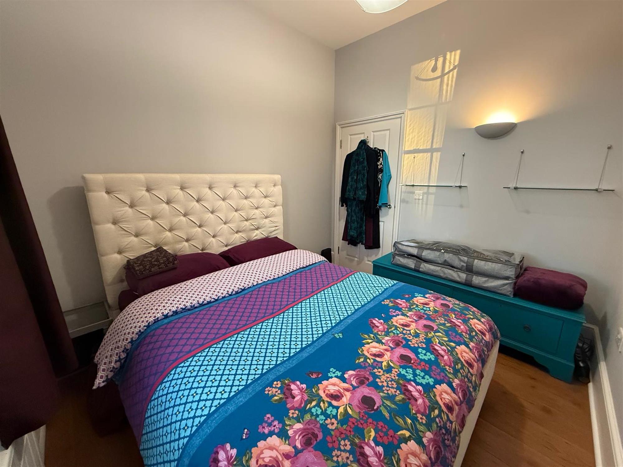 BEDROOM ONE:- Double bedroom with shelving