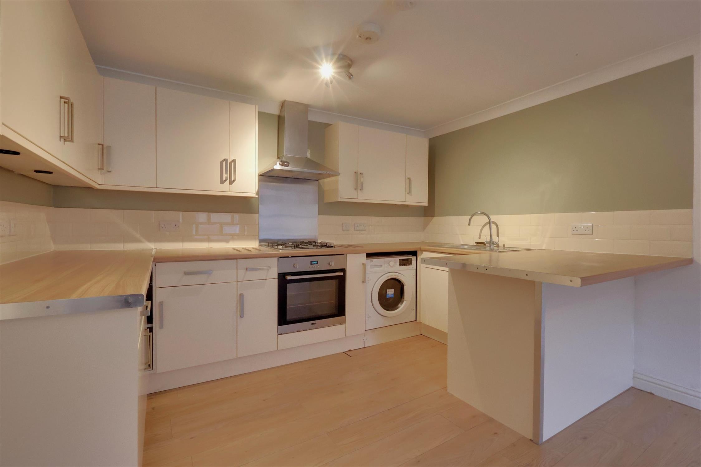 A range of wall and base cupboards with work surface over. Four ring gas hob with extractor fan over. Integrated fridge, freezer, washer/dryer and oven. Stainless steel sink with drainer. Breakfast bar.