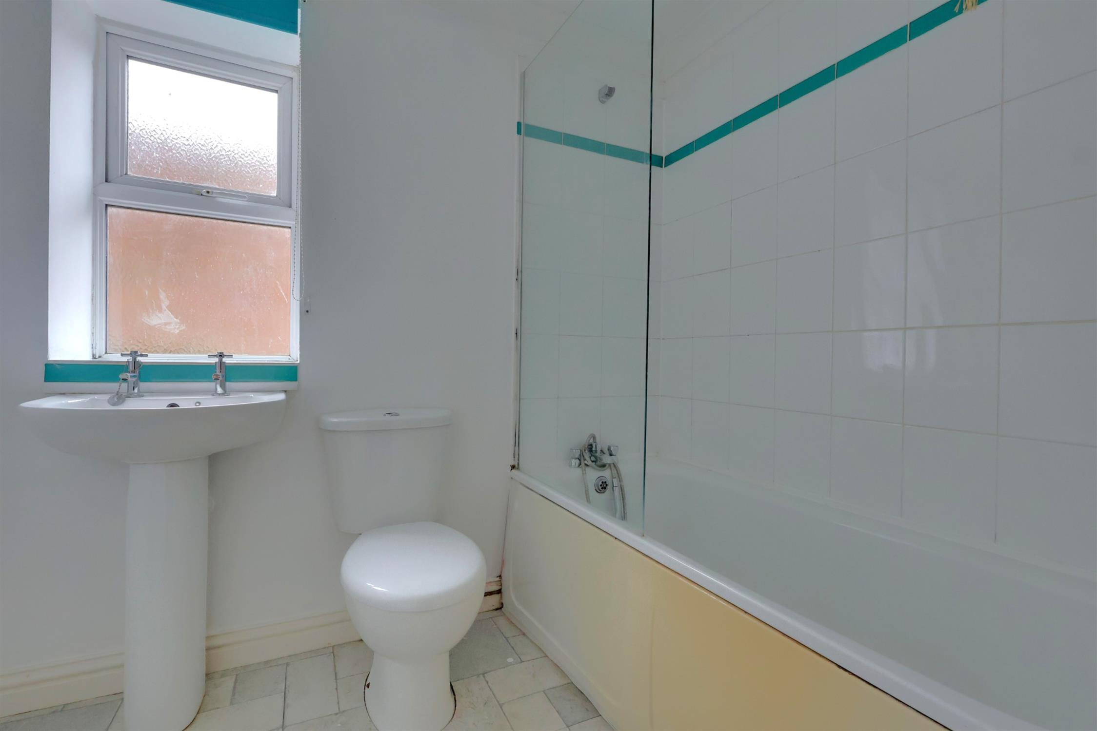Panelled bath with screen and shower attachment. WC. Ceramic sink. Radiator. Frosted double glazed window.