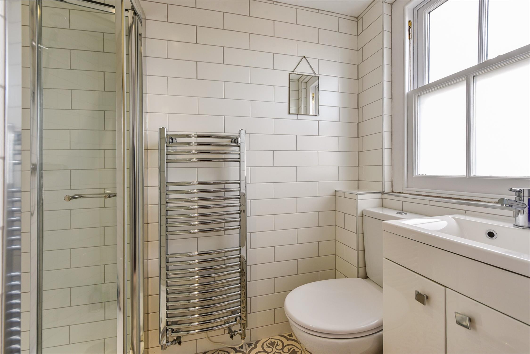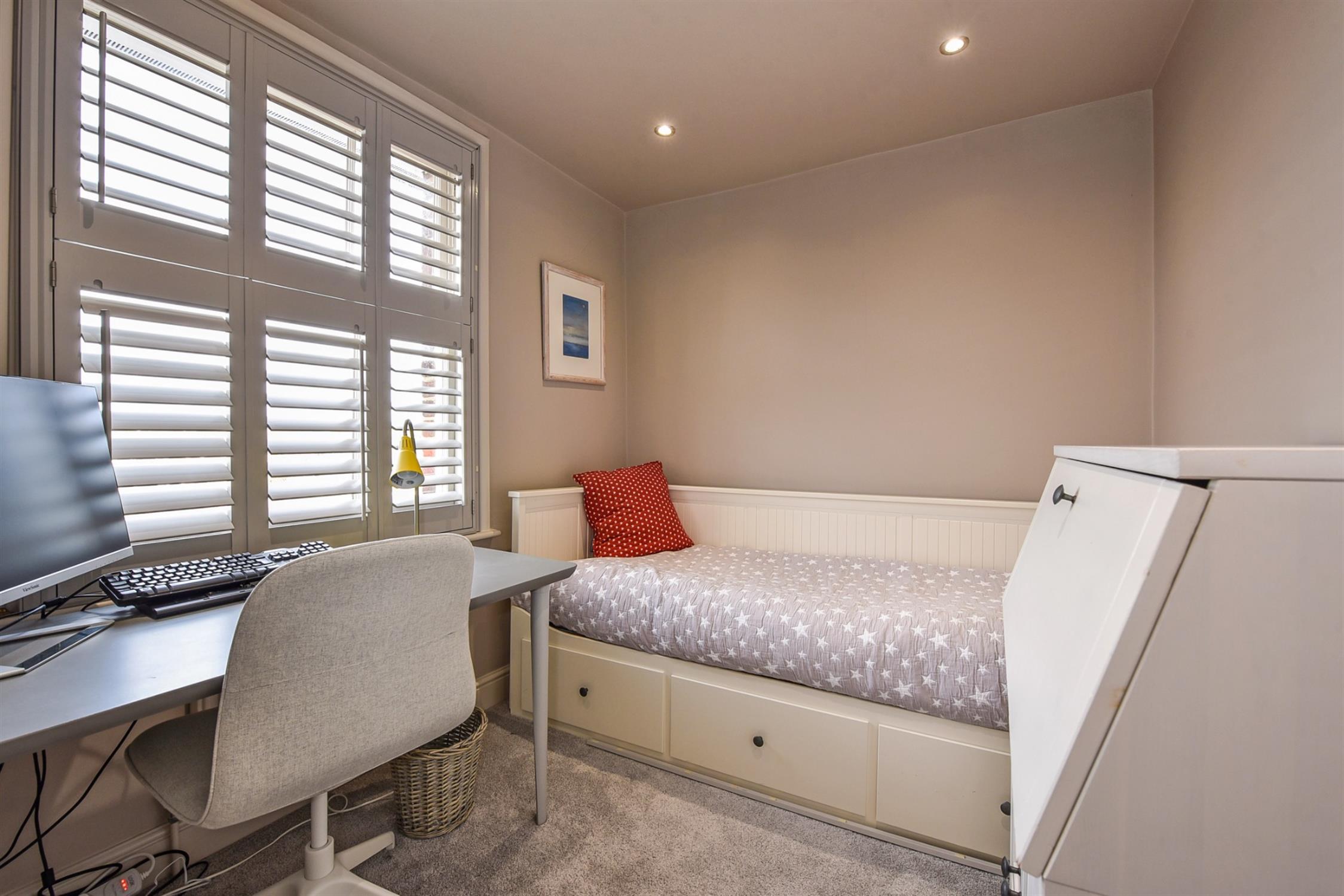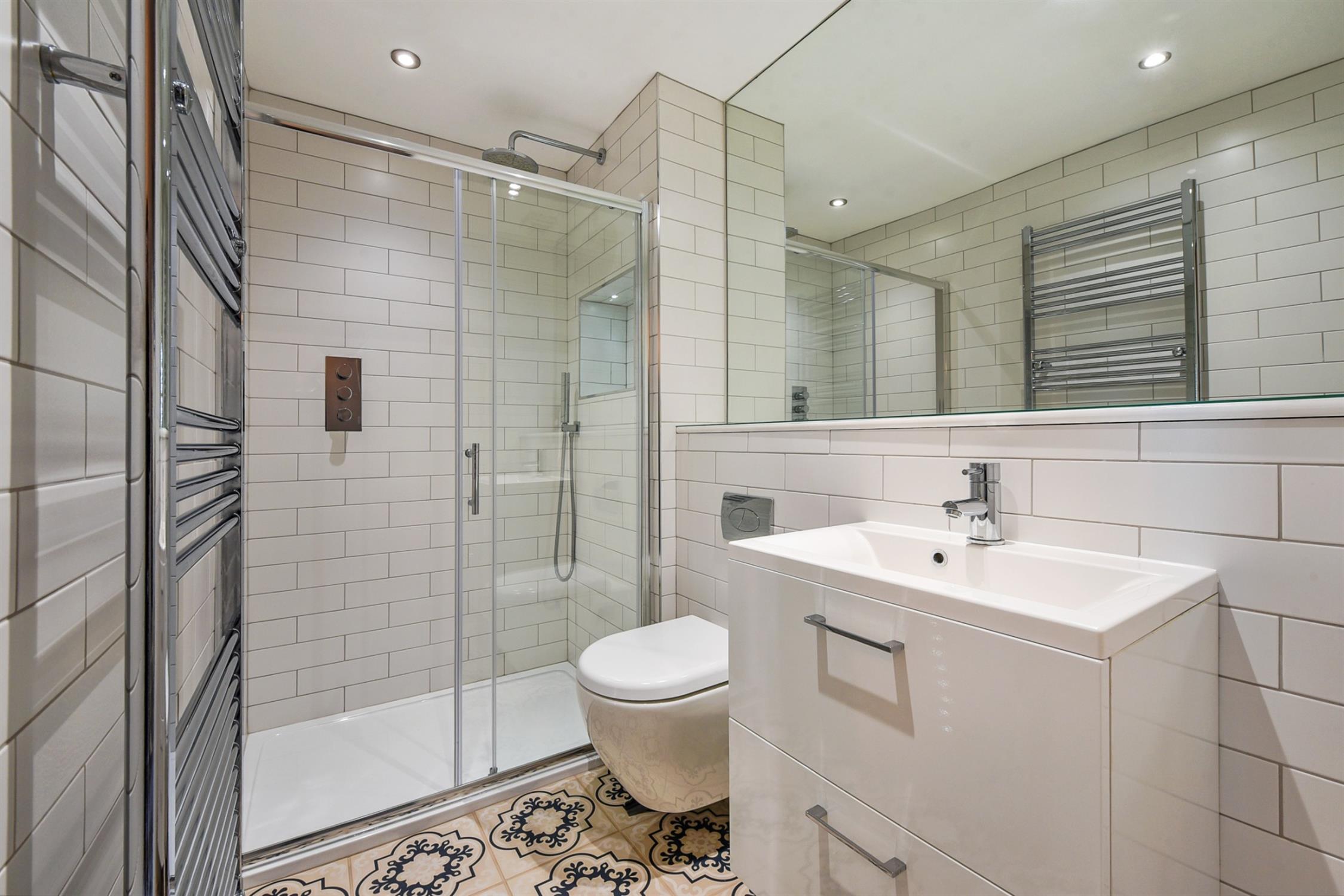 On the first floor, there are two bedrooms and a bathroom. One of the bedrooms is a good size double with feature fireplace and the other currently acts as a home-office space. The bathroom is a white suite and is fitted with a waterfall shower, toilet, vanity unit and chrome heated towel rail. These rooms have pocket doors which are particularly neat space-savers.
