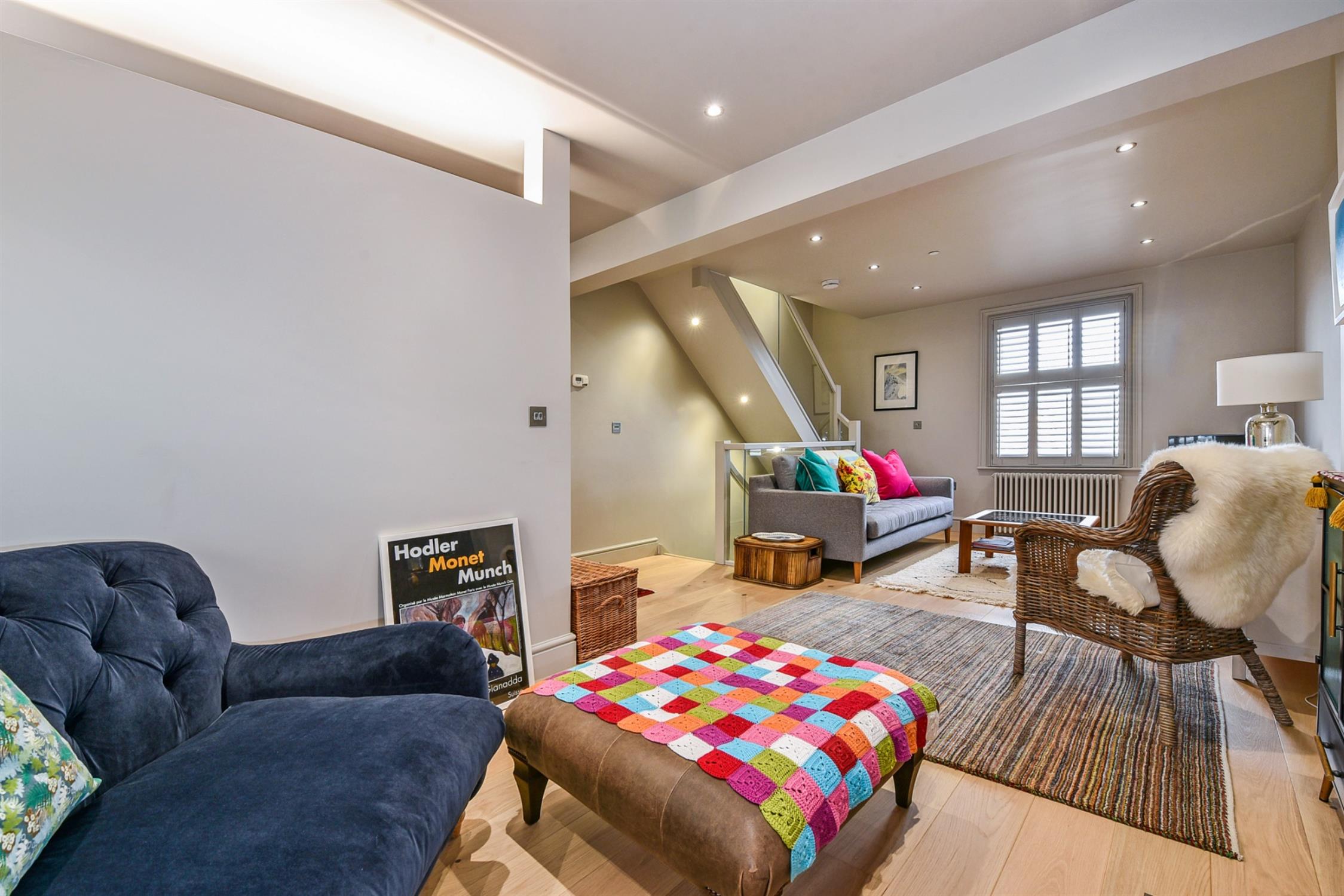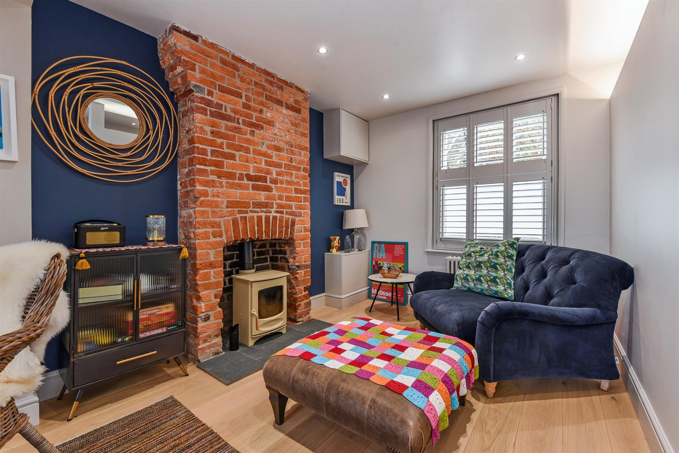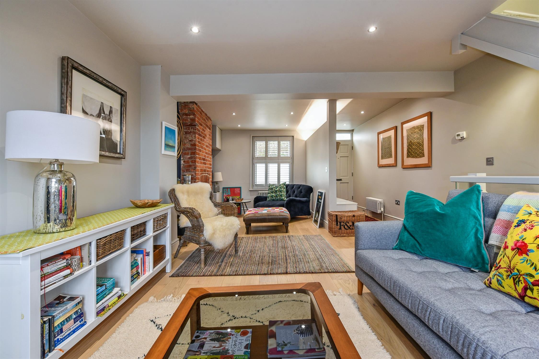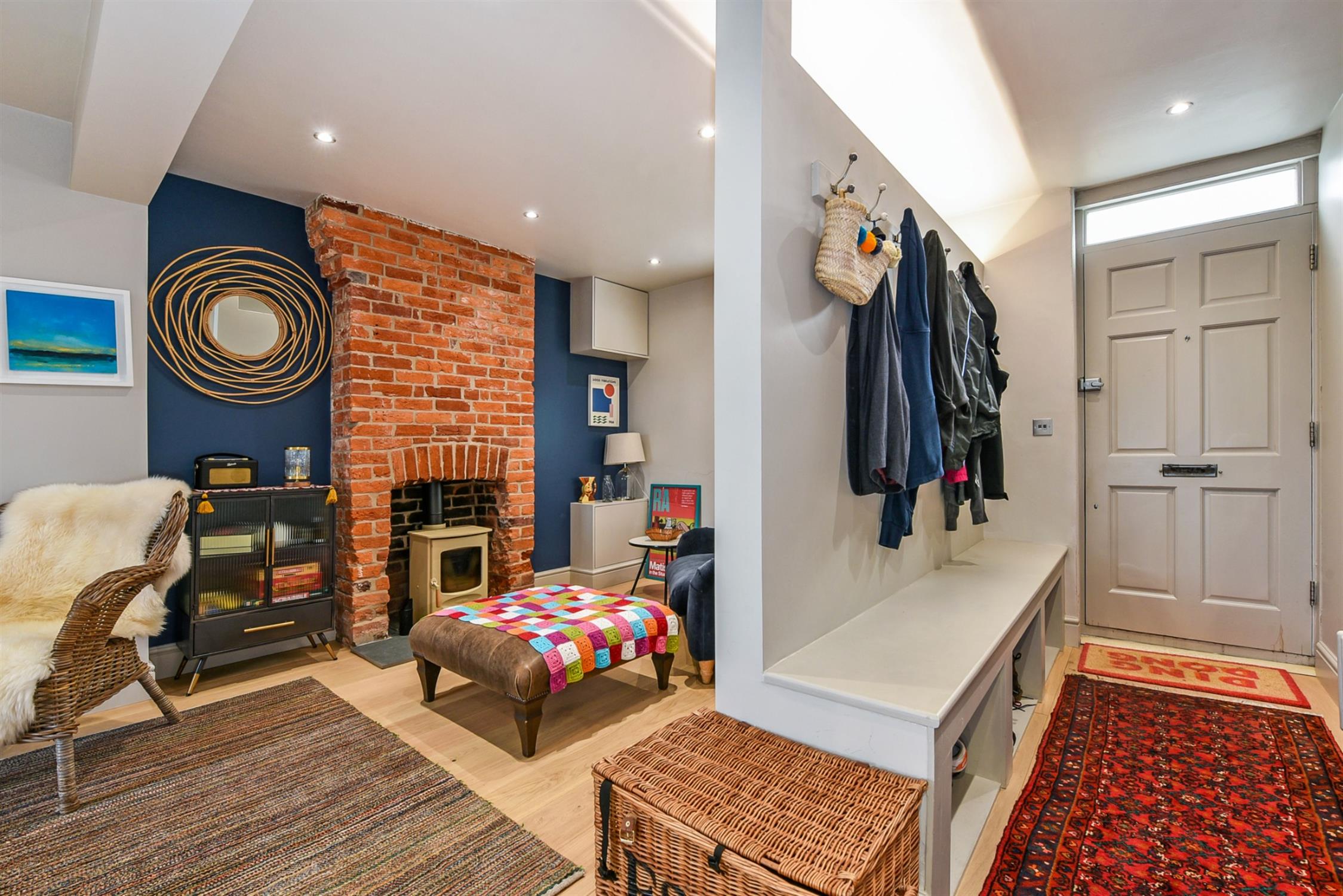 To the front of the property, steps lead down alongside a flowerbed bank to the front door. Upon entry, there is a useful hall area with space for shoes and coats. This floor was opened up by the current owners, creating a wonderful dual-aspect space with plenty of natural light. There are two separate seating areas including a cosy snug with a wood burner and exposed brick fireplace. Hardwood flooring runs throughout the space and glass bannisters on the stairs provide a contemporary edge.