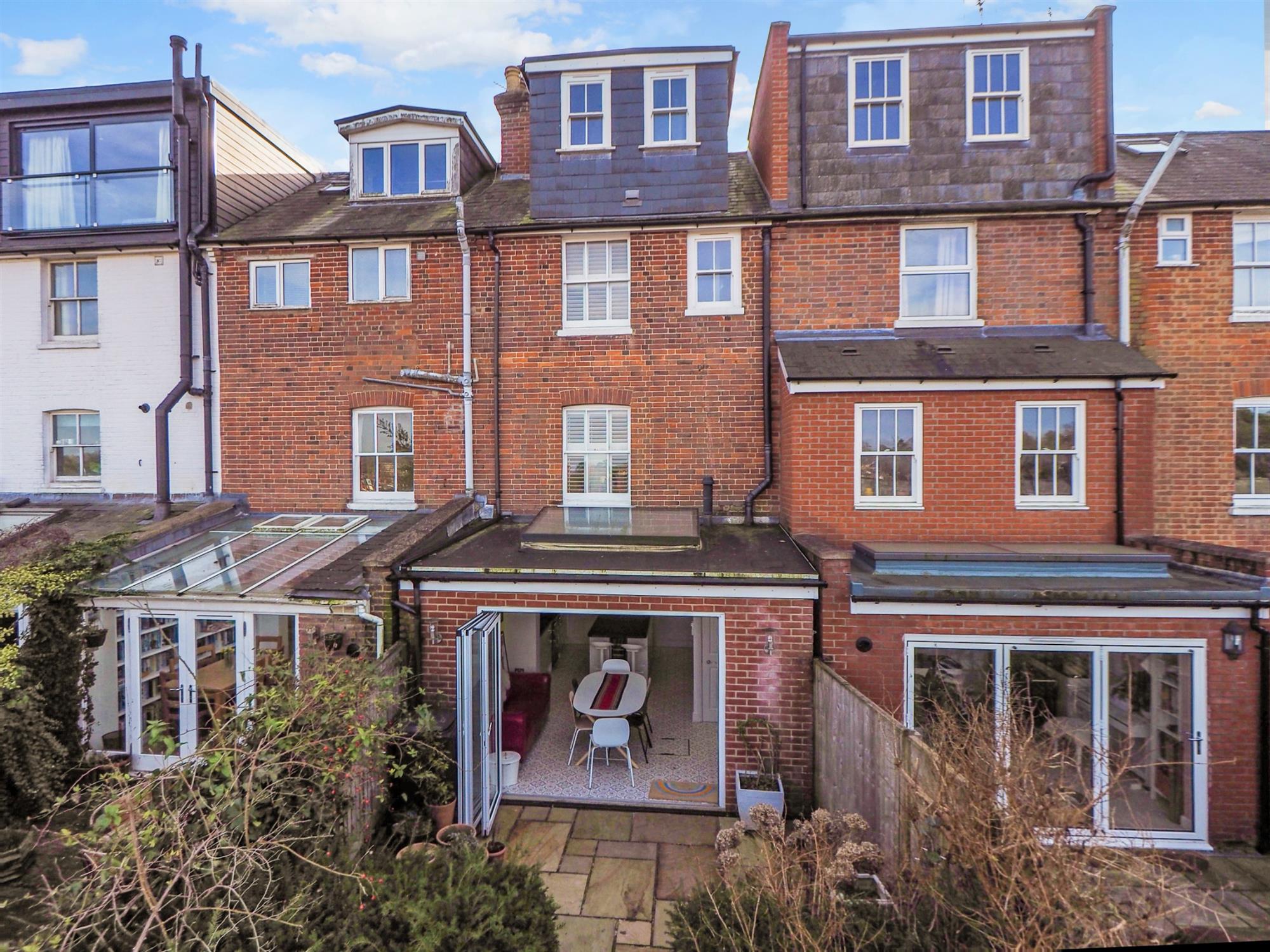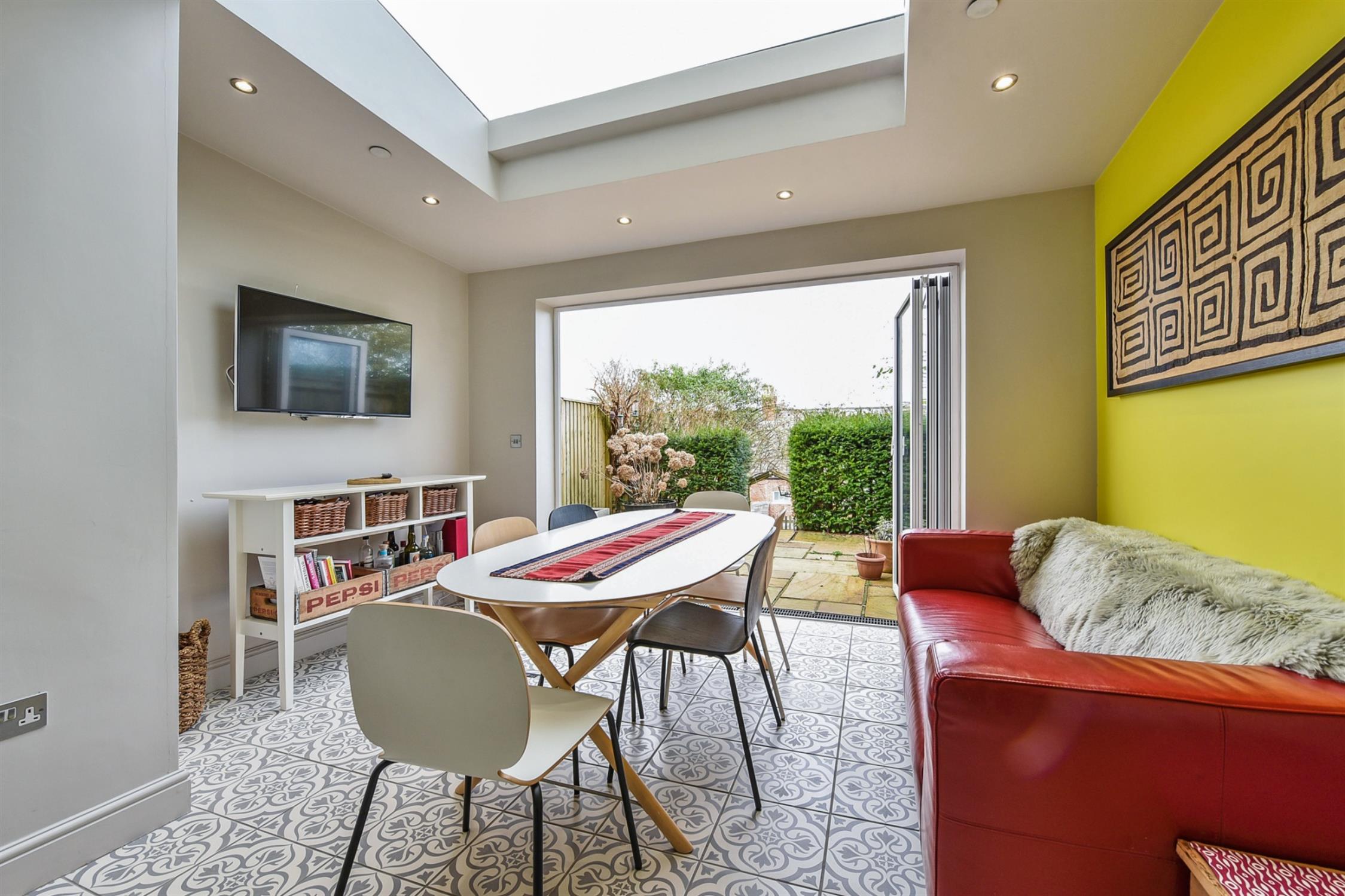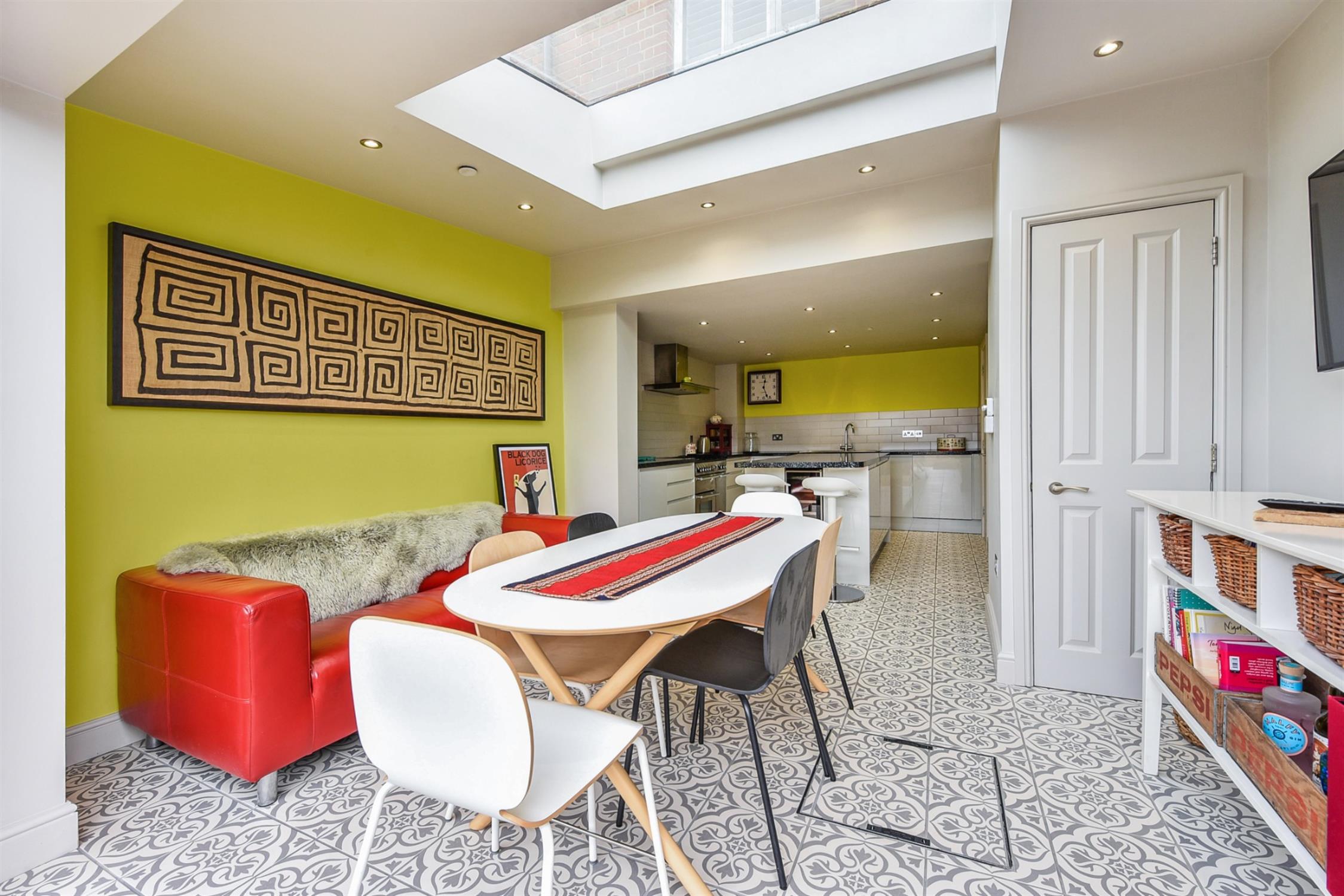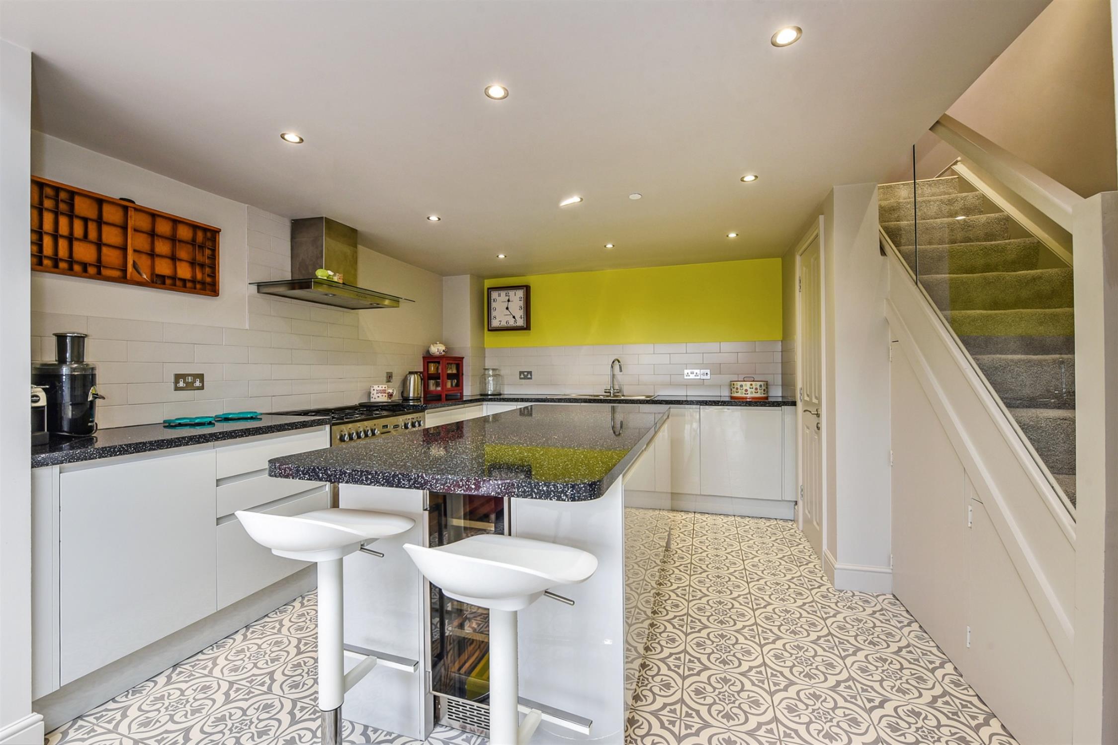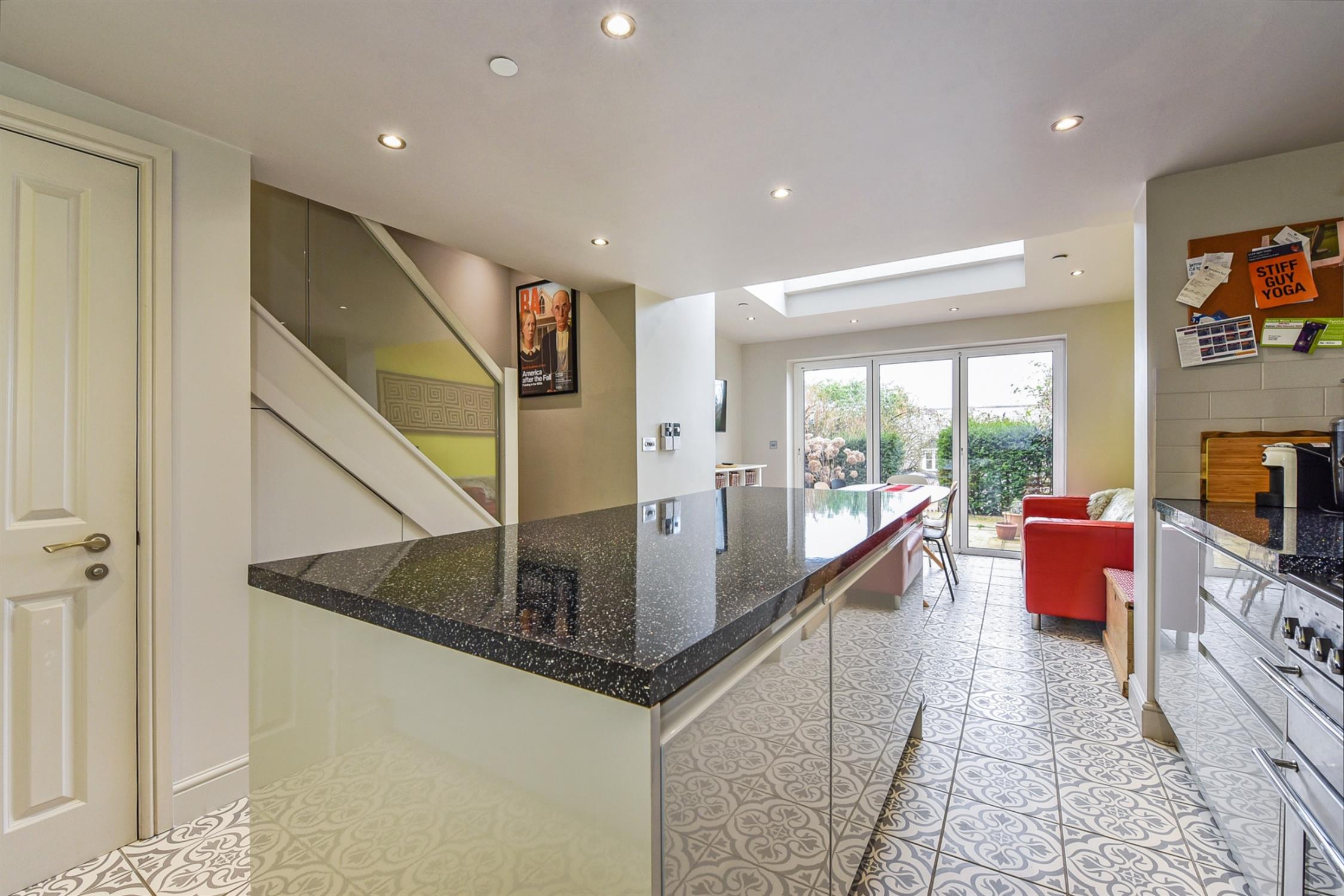 From the living room, stairs lead down to the social kitchen/dining room. This is a terrific room with ample space for entertaining, and bifold doors opening the rear of the space to the rear garden. The kitchen is fitted with a range of eye and low-level units with a large island in the centre with wine fridge and breakfast seating area, and there is also a large-format skylight located above the dining area. Finishing off this floor is a WC and several built-in storage cupboards.