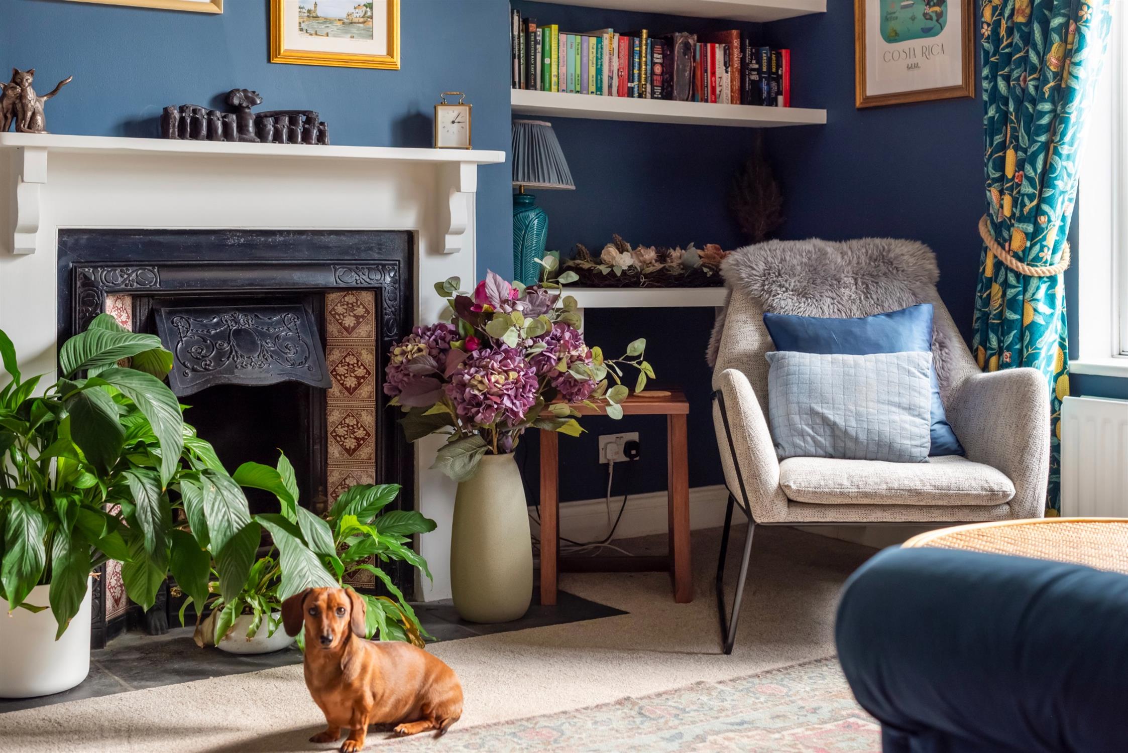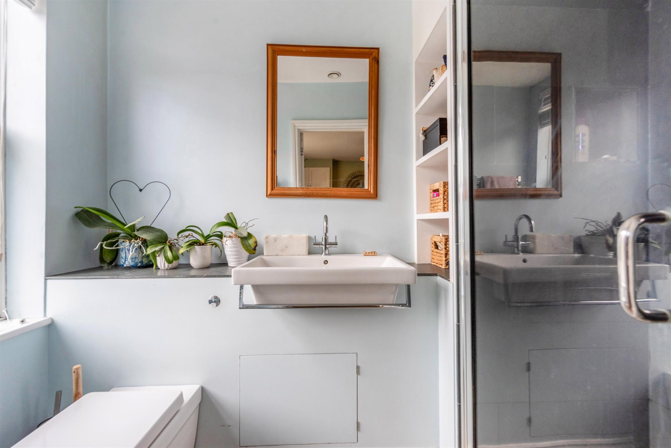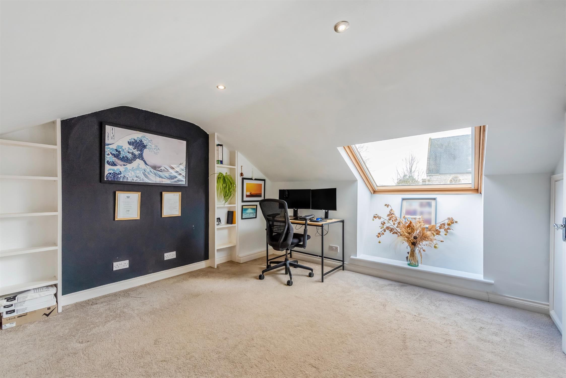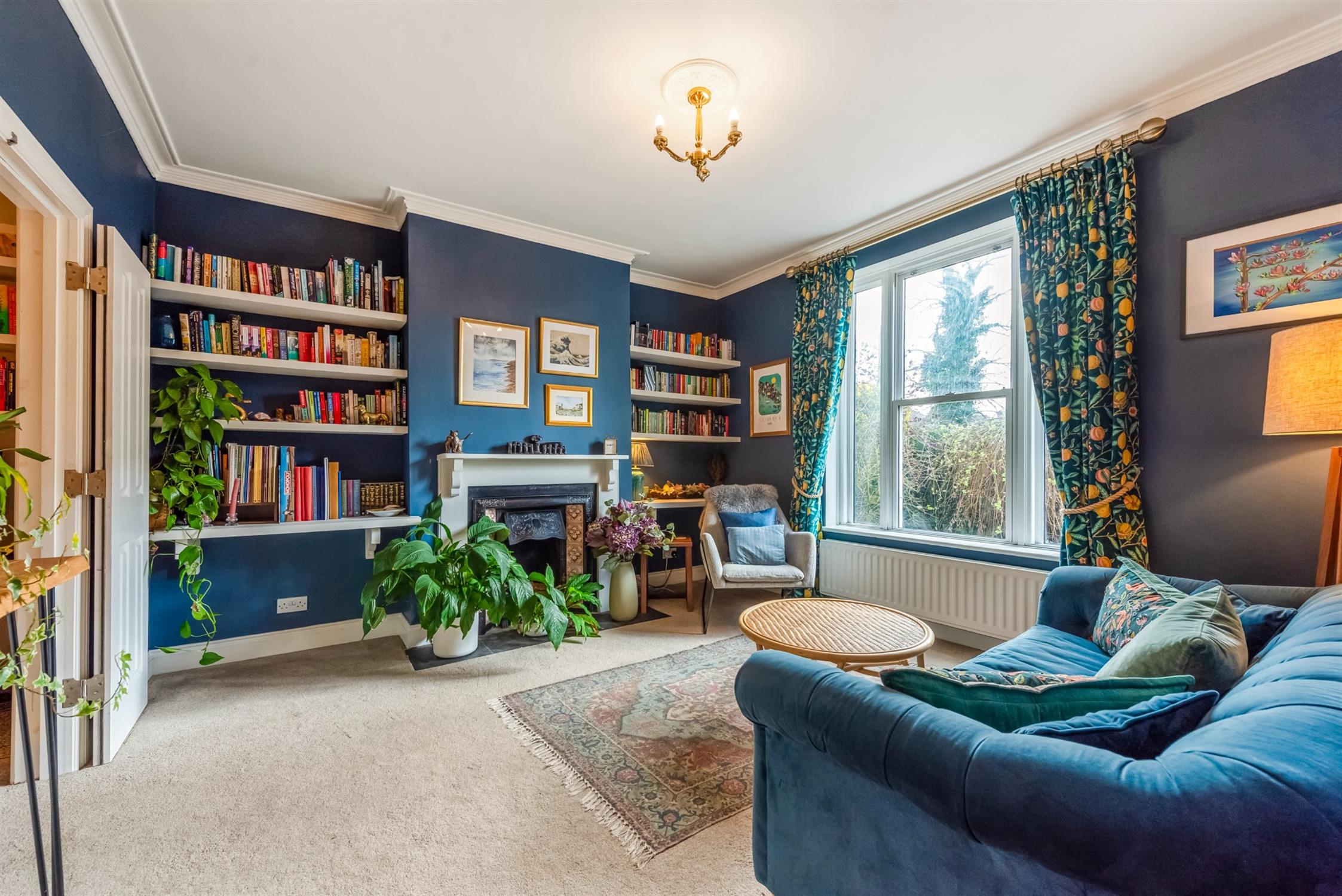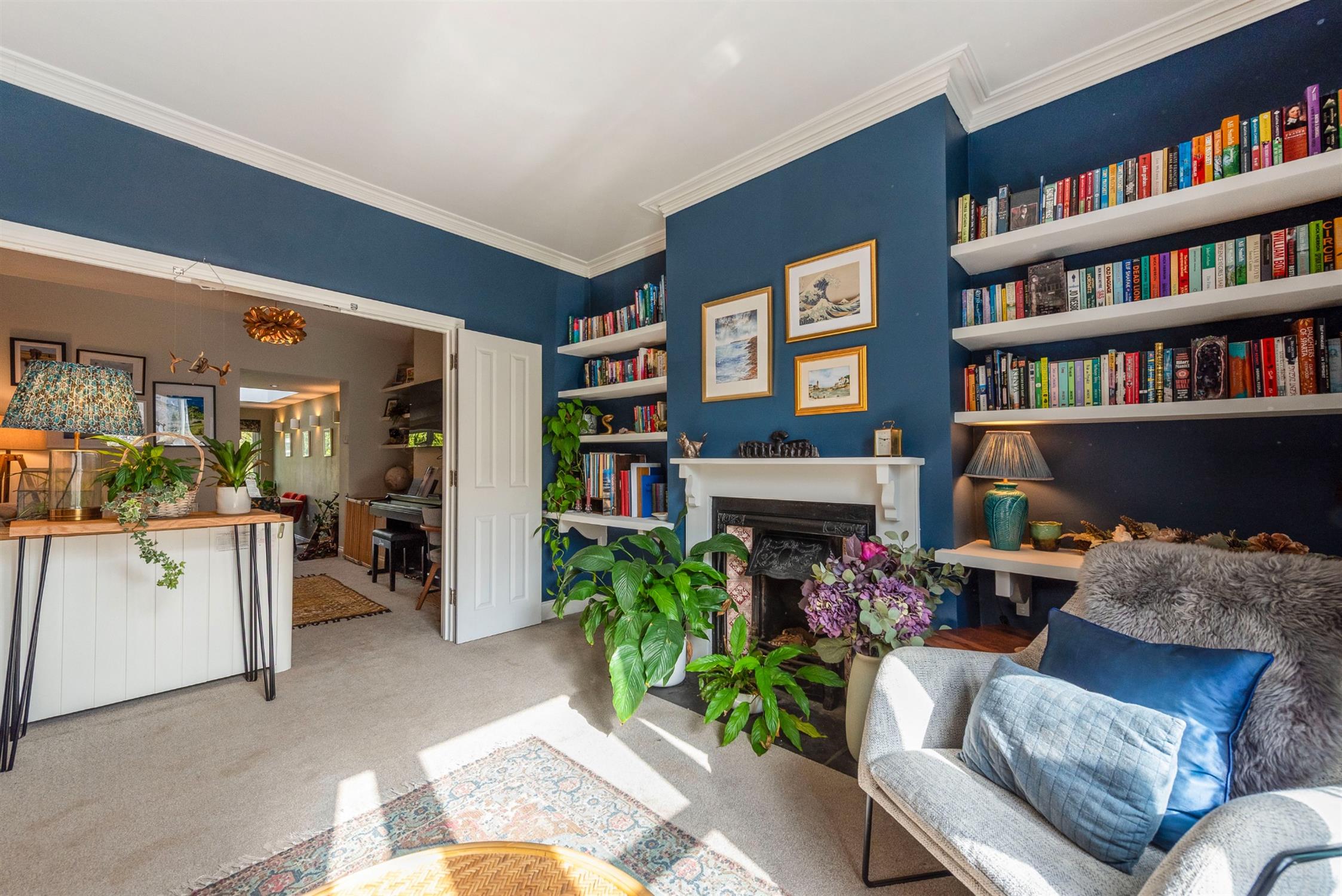 To the front of the house, the principal reception room is an elegant space, complete with an open fireplace, fitted shelving and ornate ceiling cornicing. The current vendors have decorated beautifully and instilled a lovely style and personality throughout.