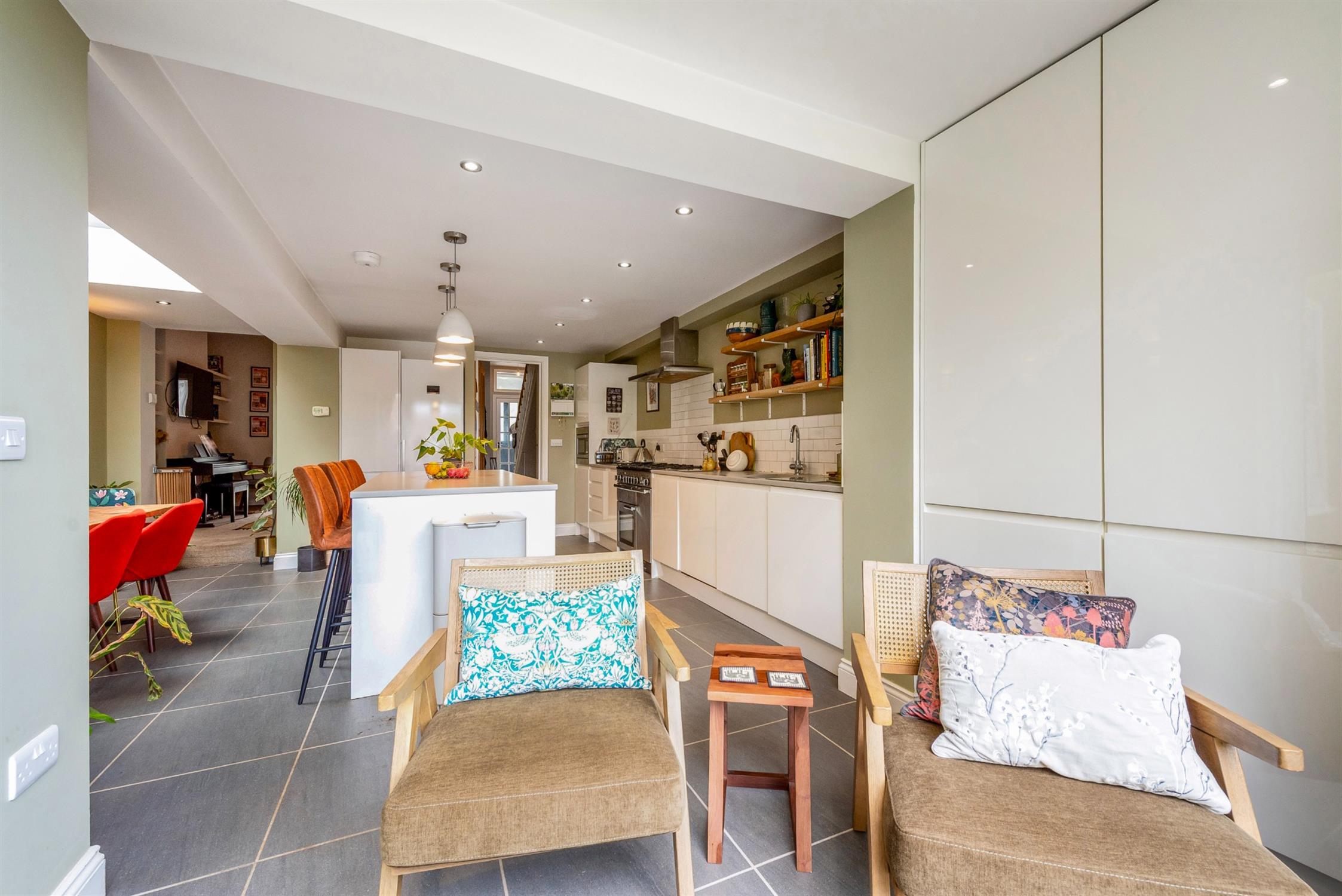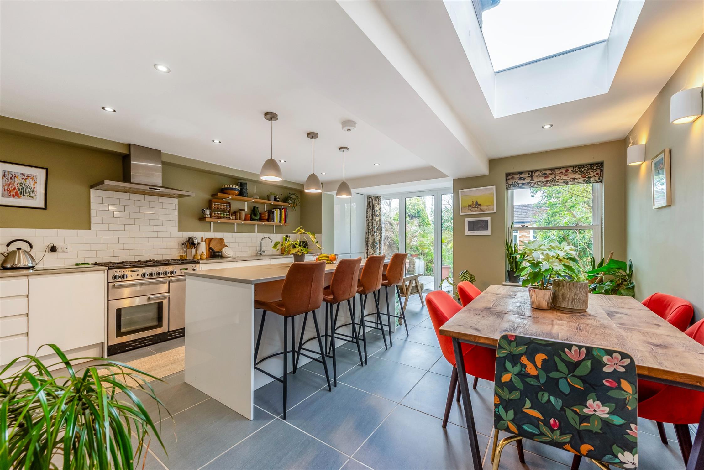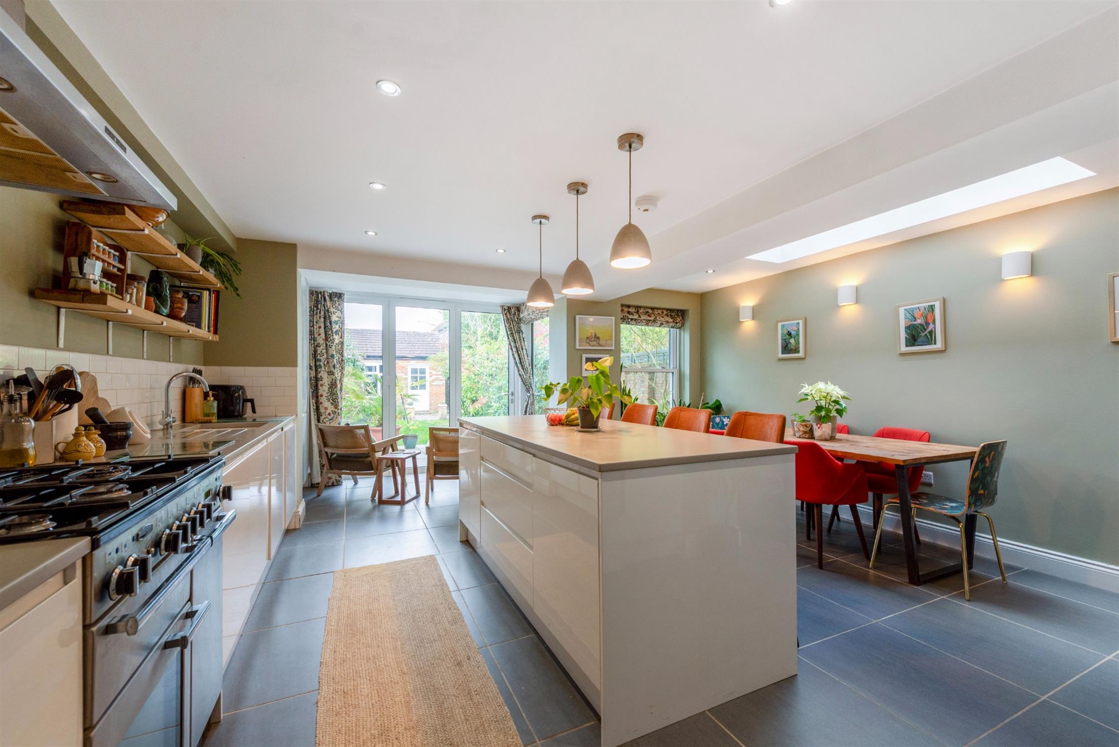 The kitchen is a particular highlight, having been widely extended to create a bright and sociable kitchen/dining/family space. The whole space enjoys the benefit of underfloor heating. A large lantern roof light floods the room with natural light, while bi-fold doors open seamlessly onto the garden from a bright reading nook. The kitchen itself is stylishly appointed with a range of sleek handleless units, solid Caesarstone work surfaces and an integrated dishwasher, along with Rangemaster cooker with five ring hob.