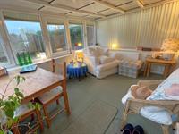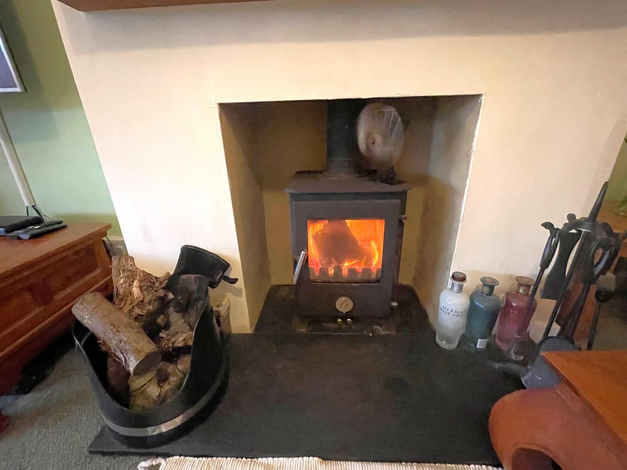 Wood burner connected with mantle over. Television point. Radiator. Opening into: